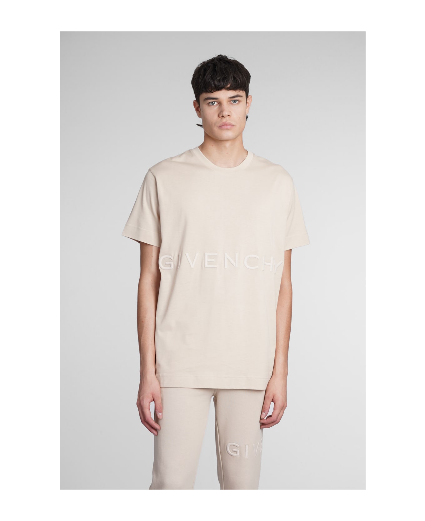 T-Shirt in beige cotton, round neck, short sleeves, embossed front logo, 100% cotton, Made in Portugal, Model is 1. 83 and wears size M