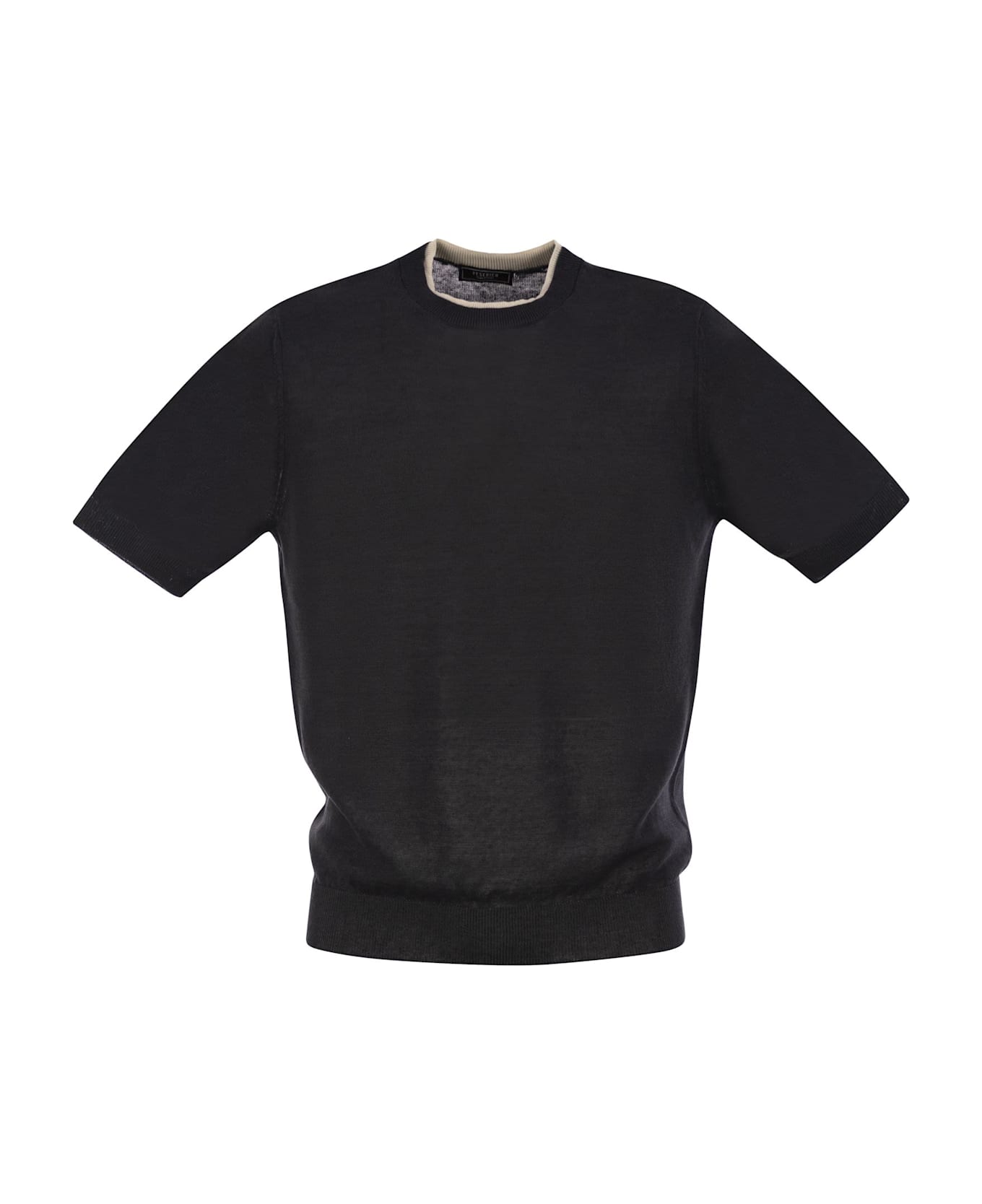 This cotton and linen yarn T-shirt is the perfect choice for a casual yet sophisticated look. The shaved knit gives the fabric a smooth and light texture, while the combination of cotton and linen ensures a fresh and breathable feel. Perfect to wear on its own or under a jacket/blazer, this T-shirt is a versatile must-have that can easily be combined with any outfit. - T-shirt in cotton and linen yarn - Plain knit - Round neckline - Short round sleeves - Ribbed neck finish - Ribbed milleraiese cuffs and hem with contrasting stripe on margin - Regular fit - Contrasting inner collar edging DESIGNER ID: R59041F12 D9056 D61