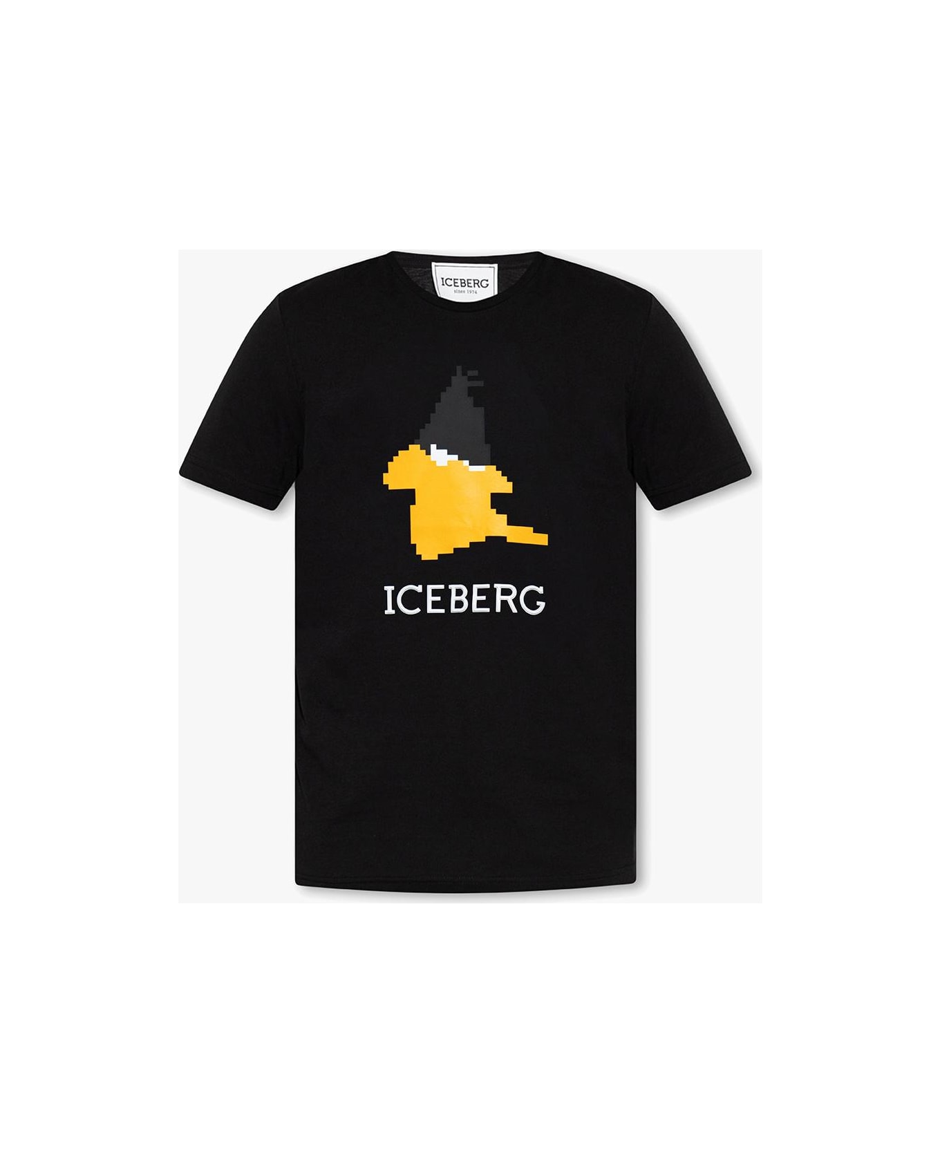 Black crewneck T-shirt from Iceberg. Made of cotton, this style features short sleeves, an elasticated collar and a colourful graphic print accompanied by a logo appliqué.