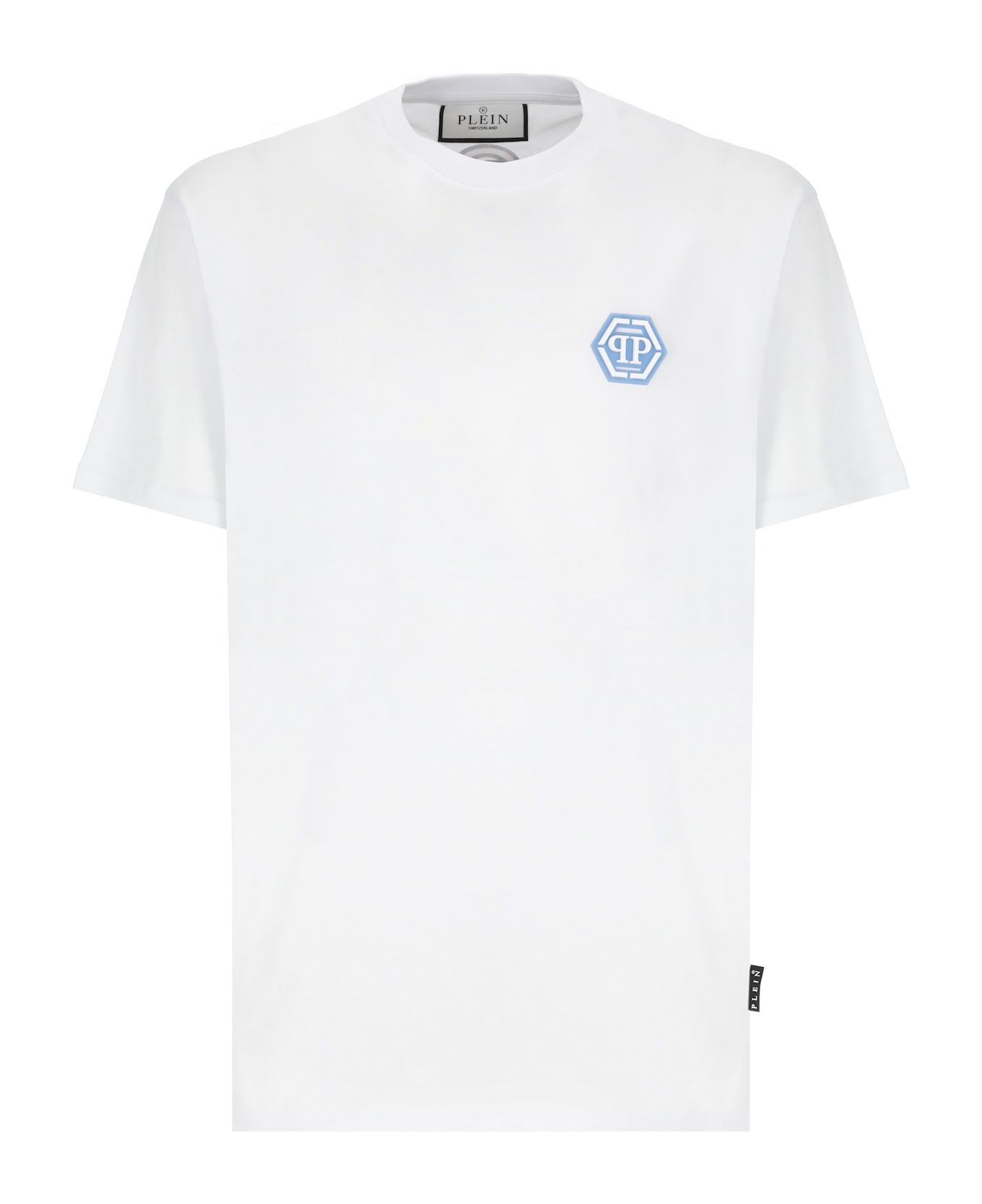 - White Philipp Plein cotton t-shirt for man - Crew neck - Short sleeves - Front logoed patch - Rear contrasting color logoed print
