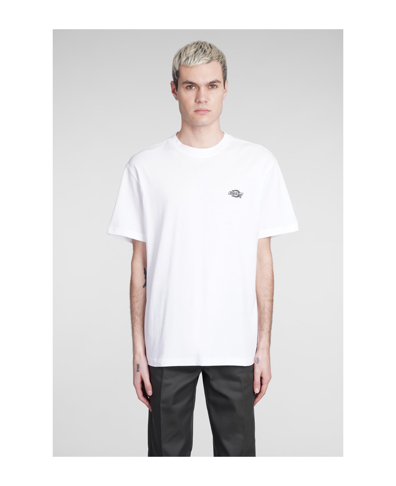 T-Shirt in white cotton, round neck, short sleeves, logo on chest, 100% cotton, Made in Turkey, Model is 1. 83 and wears size M