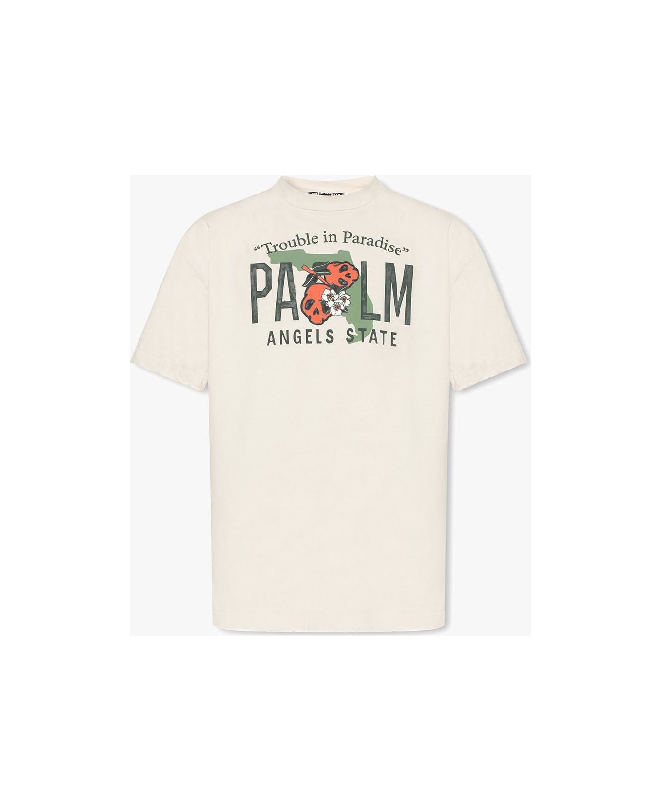 Beige distressed T-shirt from Palm Angels. Made of cotton, this short sleeve design features a multicolored logo print and ribbed crew neck. Composition: 100% Cotton