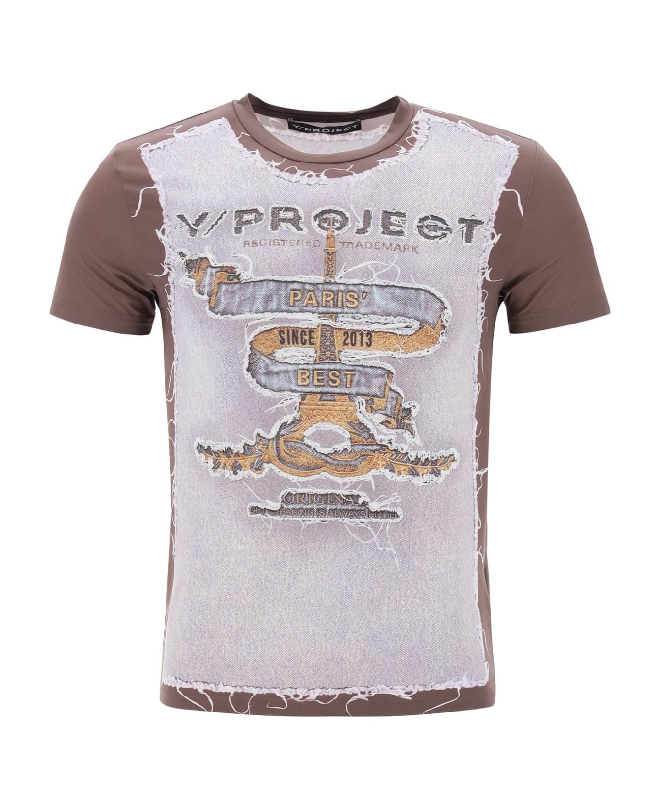 Unisex crewneck t-shirt from the collaboration between Y-Project and Jean Paul Gaultier made of stretch techno jersey and characterized by trompe l'oeil effect print at front and back. Slim fit. The model is 187 cm tall and wears a size L.