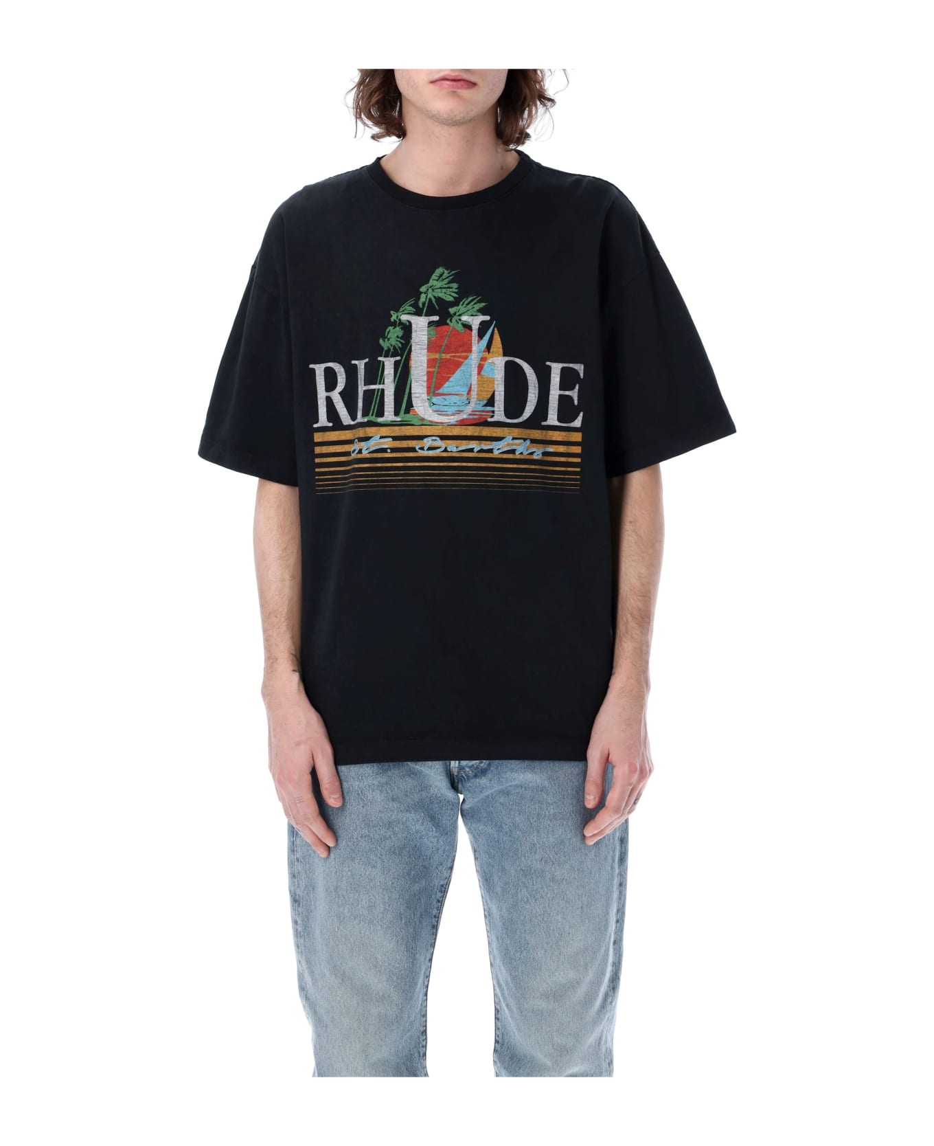 Cotton Tropics T-shirt By Rhude. Featuring: Ribbed Crew Neck Short Sleeves Multicolor Graphic Print At Front Loose Fit The Model Is 1,90 M Tall And He's Wearing Size L