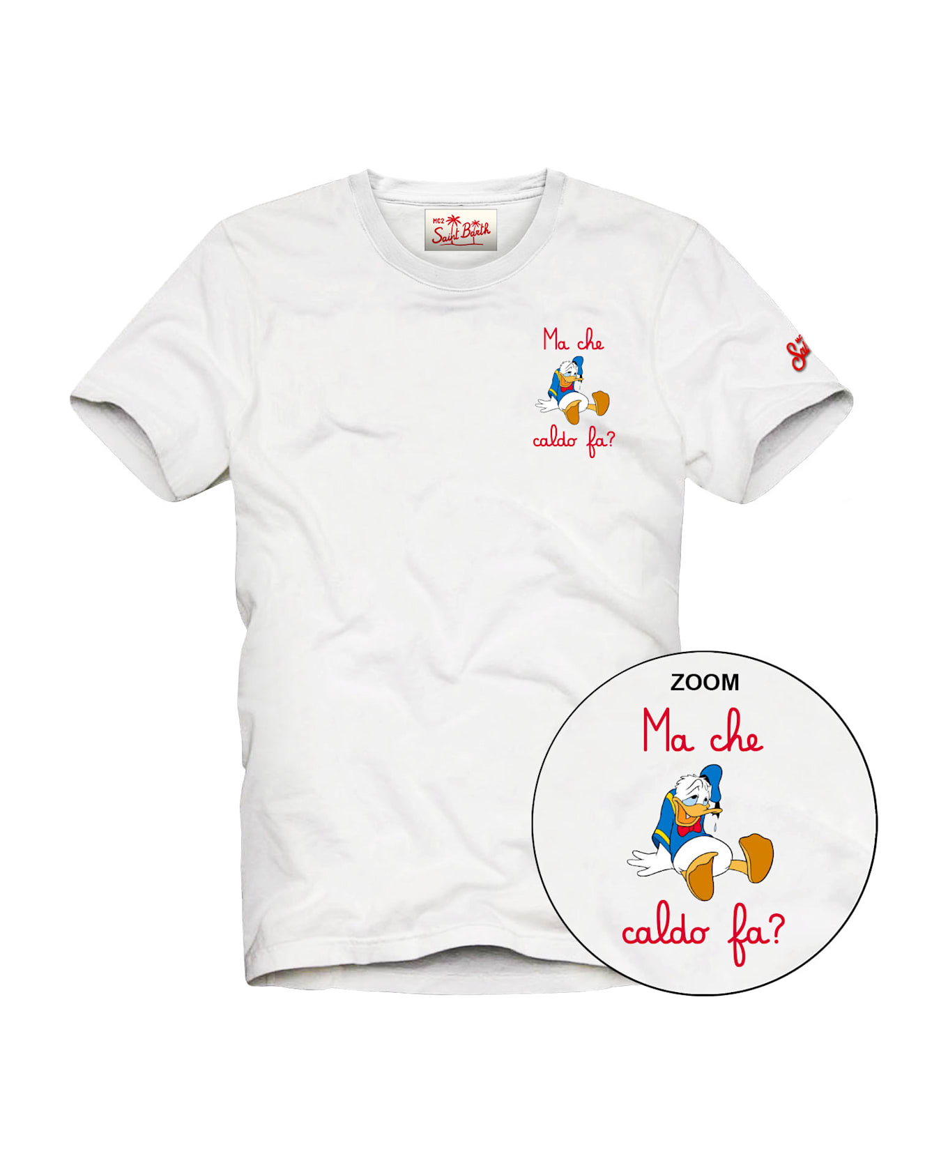 White crew neck short sleeve T-Shirt by St. Barth, made of 100% cotton jersey with piece-dyed finish, on the chest there is an embroidered print, while the MC2 Saint Barth logo is embroidered on the bottom of the left sleeve. Regular fit