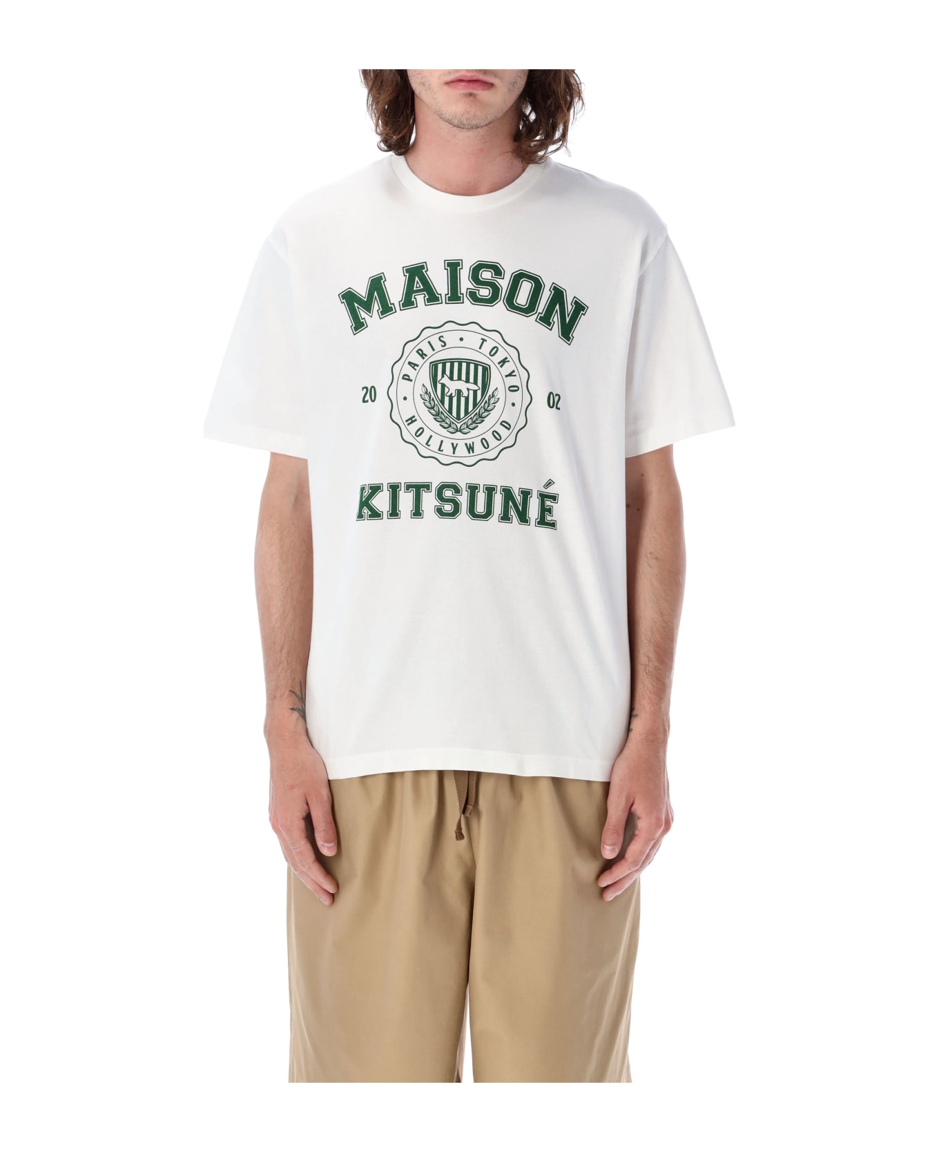 Cotton Varsity Comfort Tee By Maison Kitsuné. Featuring: Straight Cut Short Sleeves Rib-knit Trim Crewneck Varsity maison Kitsuné Print On The Chest Plain Back Maison Kitsuné X Olympia Le-tan Model Is 1,90 M Tall And He Is Wearing Size L