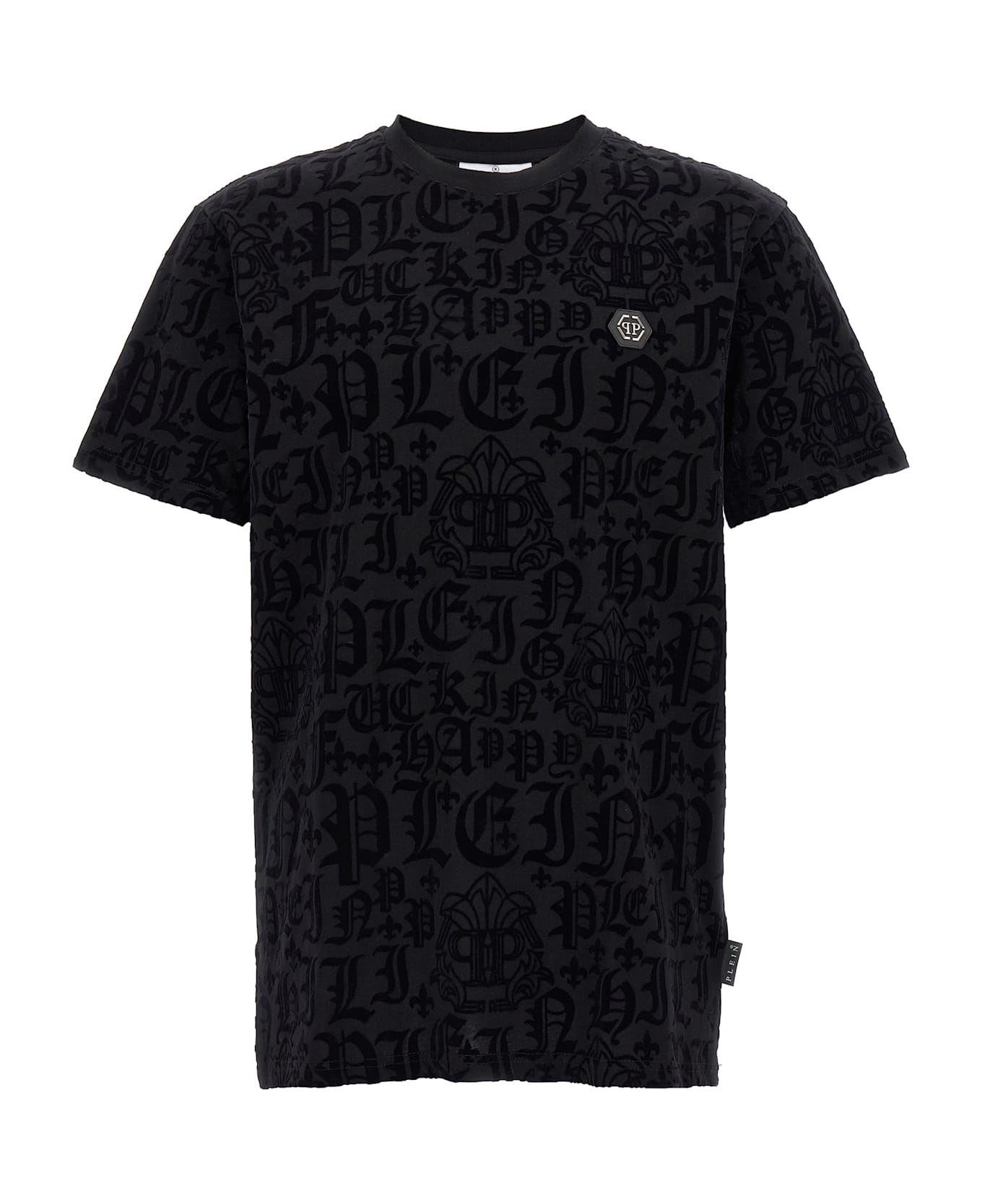 Cotton T-shirt with all-over tone-on-tone velvet logo, crew neck, leather patch with metal logo appliqué, short sleeves.