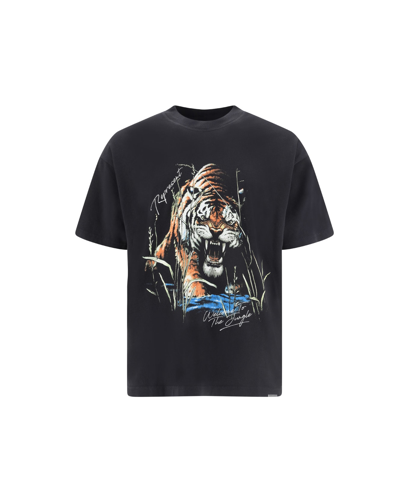 Cotton welcome to the jungle t-shirt by represent, ribbed crew neck, maxi graphic and iconic brand monogram contrasting on front, oversize fit.