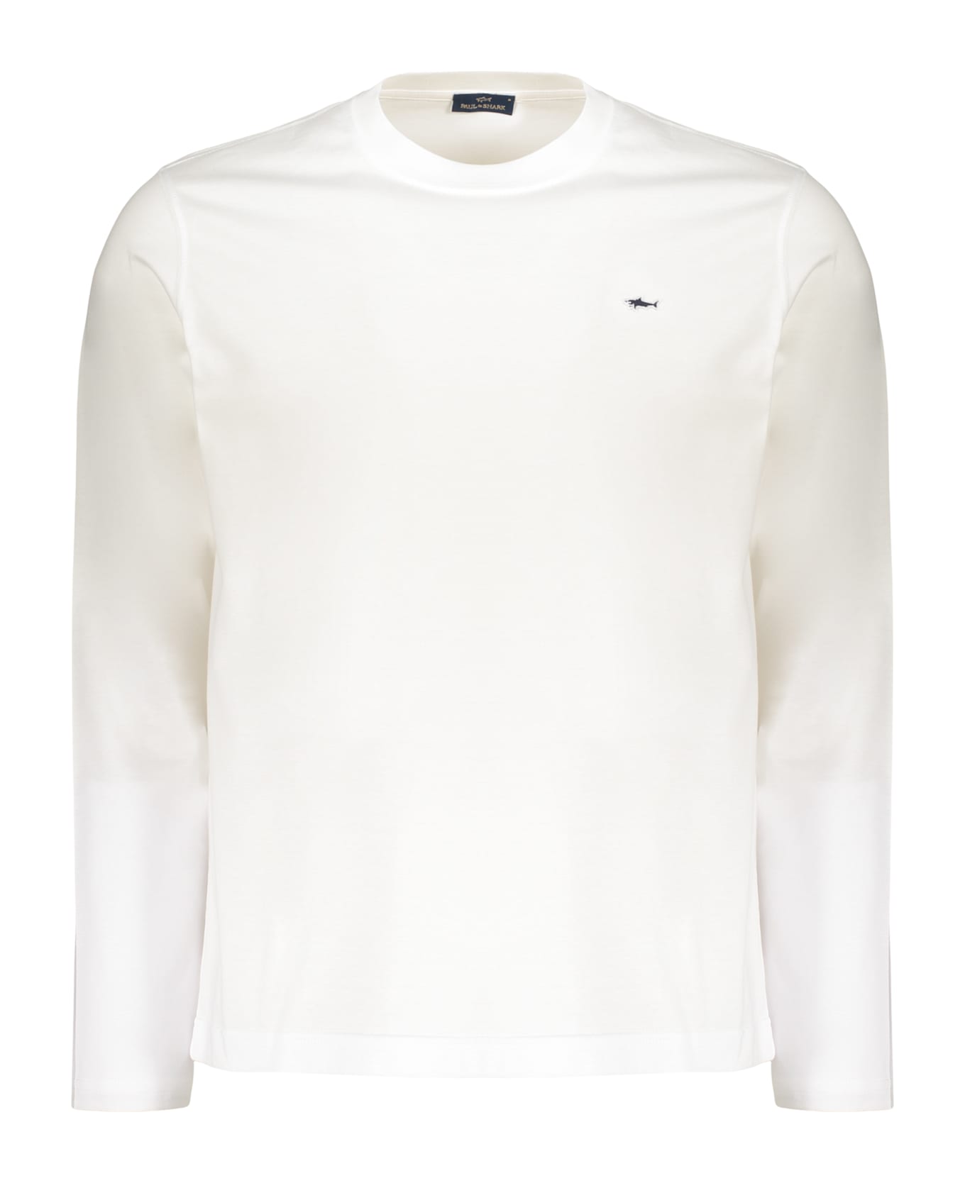 T-shirt with long sleeves in white, characterized by a simple and minimalist design. made from soft and lightweight fabric, it offers comfort and versatility for any occasion. it features a round neckline and a discreet logo on the chest, adding a touch of style without excess. ideal for pairing with jeans or casual trousers for an informal and modern look. available in different sizes to fit every silhouette.