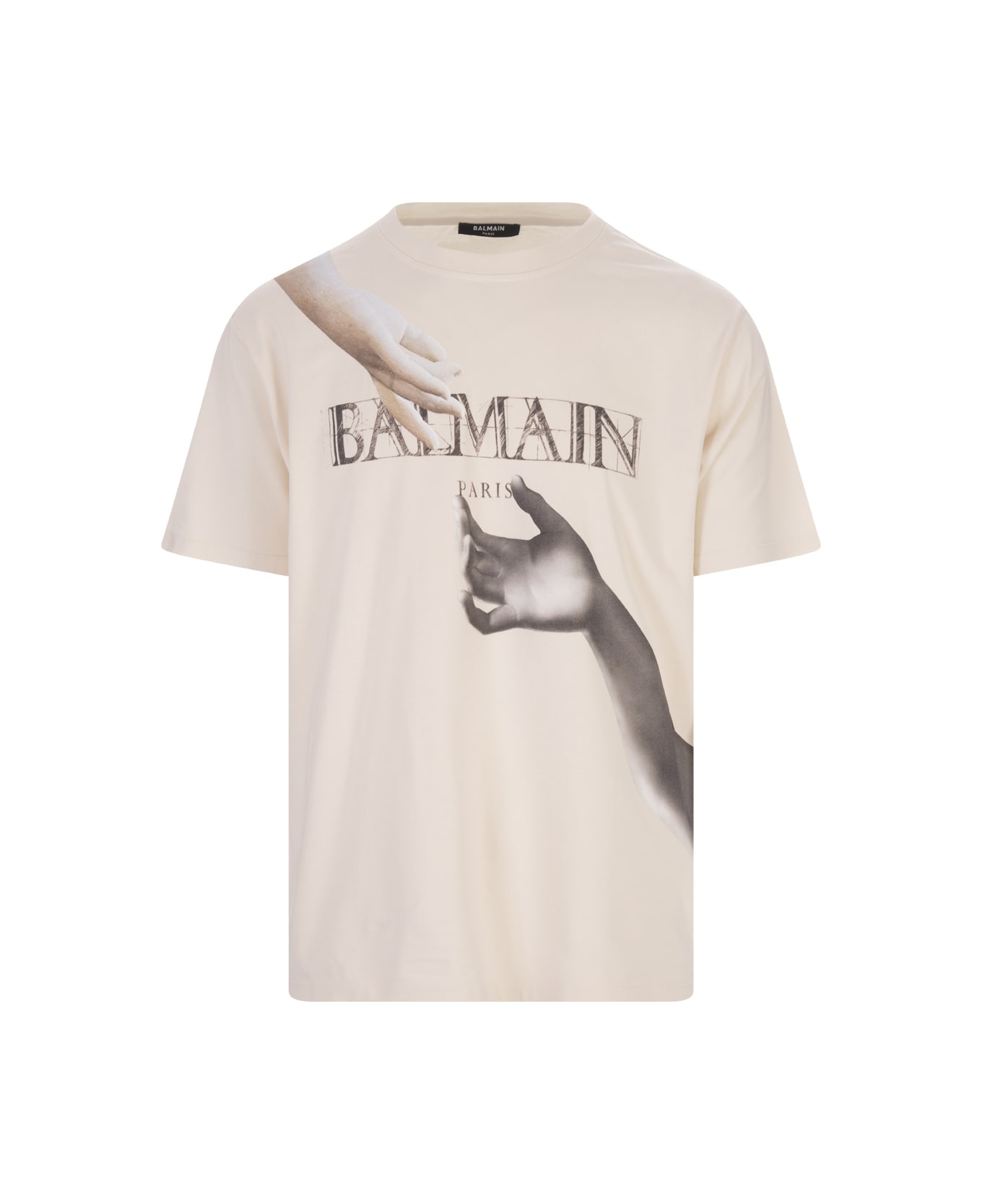 Balmain t-shirt in white cotton with round neckline, short sleeves, Statue print on the front with Roman Balmain Paris logo. Loose fit.