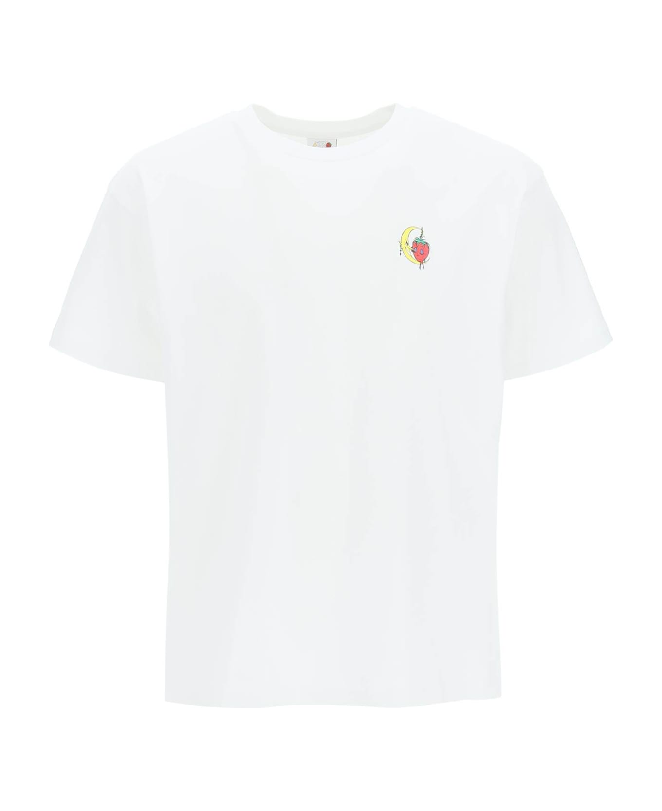 Short-sleeved t-shirt by Sky High Farm made of organic cotton jersey with mini logo redesigned by Will Sheldon printed at chest. It features ribbed crew neck and regular fit. The model is 187 cm tall and wears a size L.