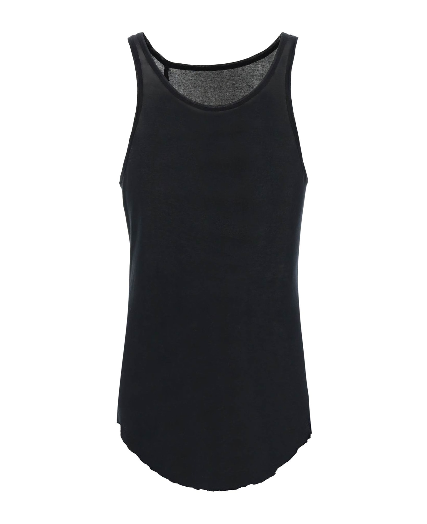 Boris Bidjan Saberi long tank top in lightweight pure cotton jersey, object-dyed. Detailed with an off-center back seam and the signature string applique, it is finished with a curved raw-cut hem and overlock stitching on the round neckline and armholes. Regular fit. The model is 187 cm tall and wears a size M.