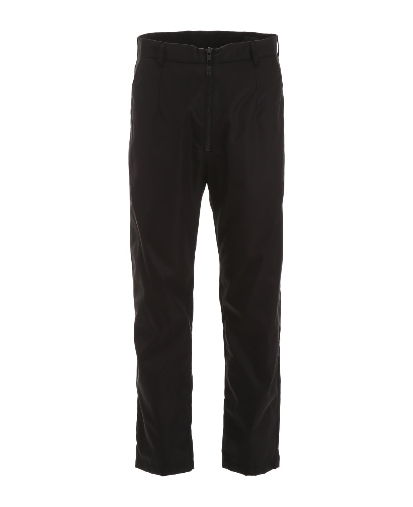 Prada nylon gabardine trousers with adjustable zipped cuffs. They feature front zip closure, front slanted pockets, back zip pockets, flap pocket with snap button. Model height is 183 cm and he is wearing a size IT 46. Composition: 100% poliammide