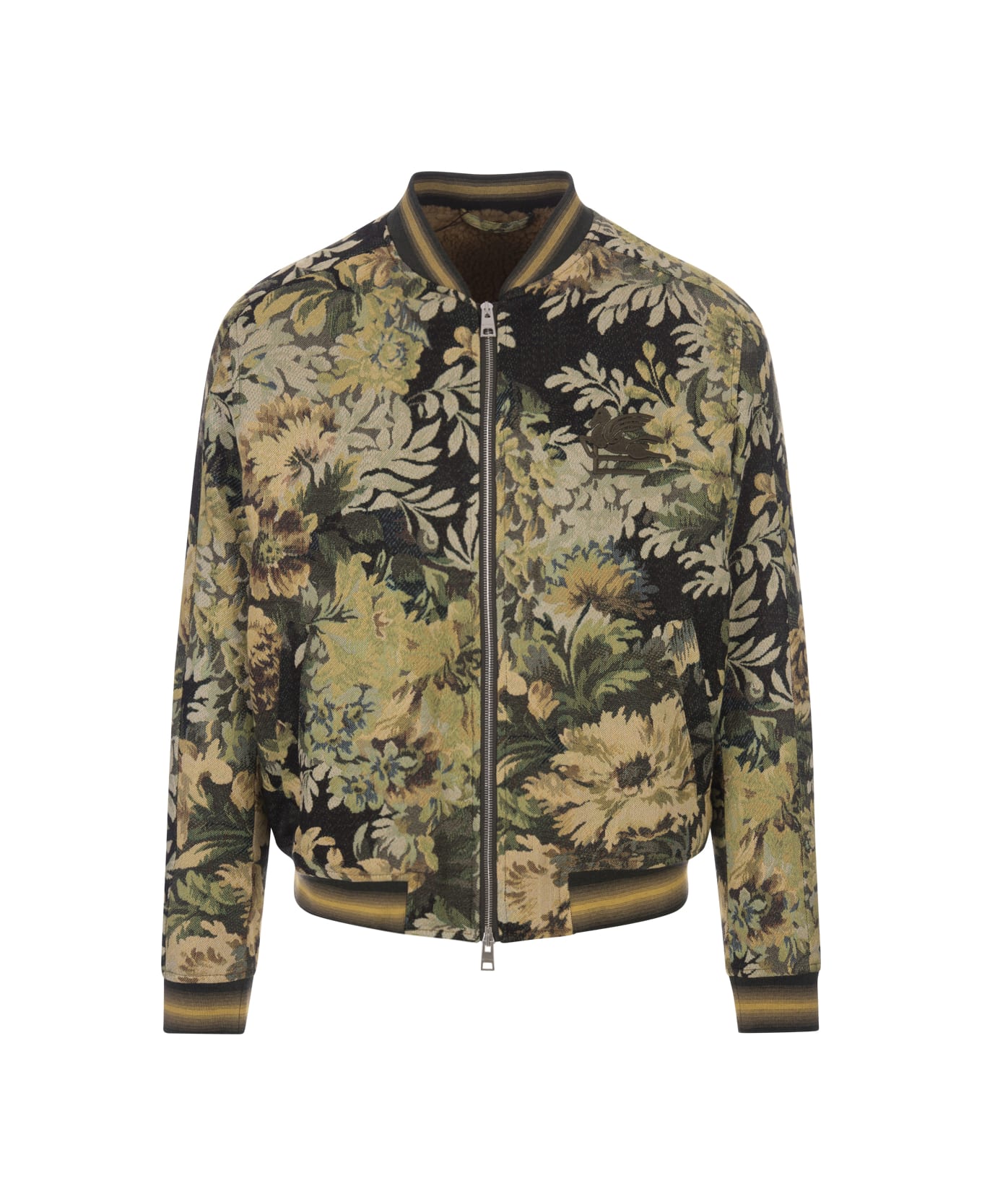 Etro bomber jacket for men made of green cotton blend with all-over flower print. The garment features long sleeves, an embroidered Etro with Pegasus logo on the chest, a double-slider front zip fastening and ribbed knit edges with a striped pattern.