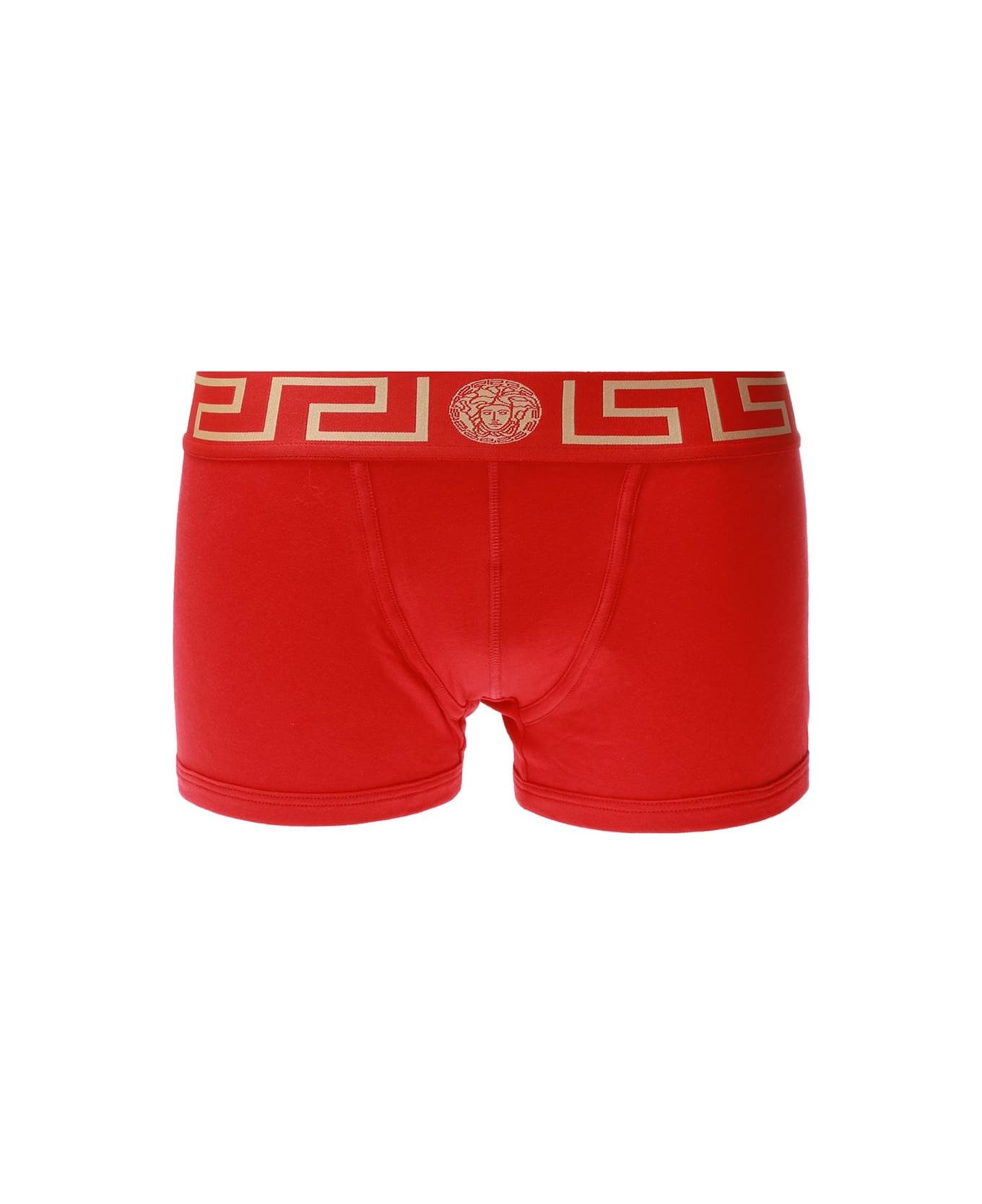 Red boxers from Versace. Made of cotton. Feature an elasticated waistband embellished with gold-tone Greek pattern and Versace logo. Composition: 94% Cotton 6% Elastane