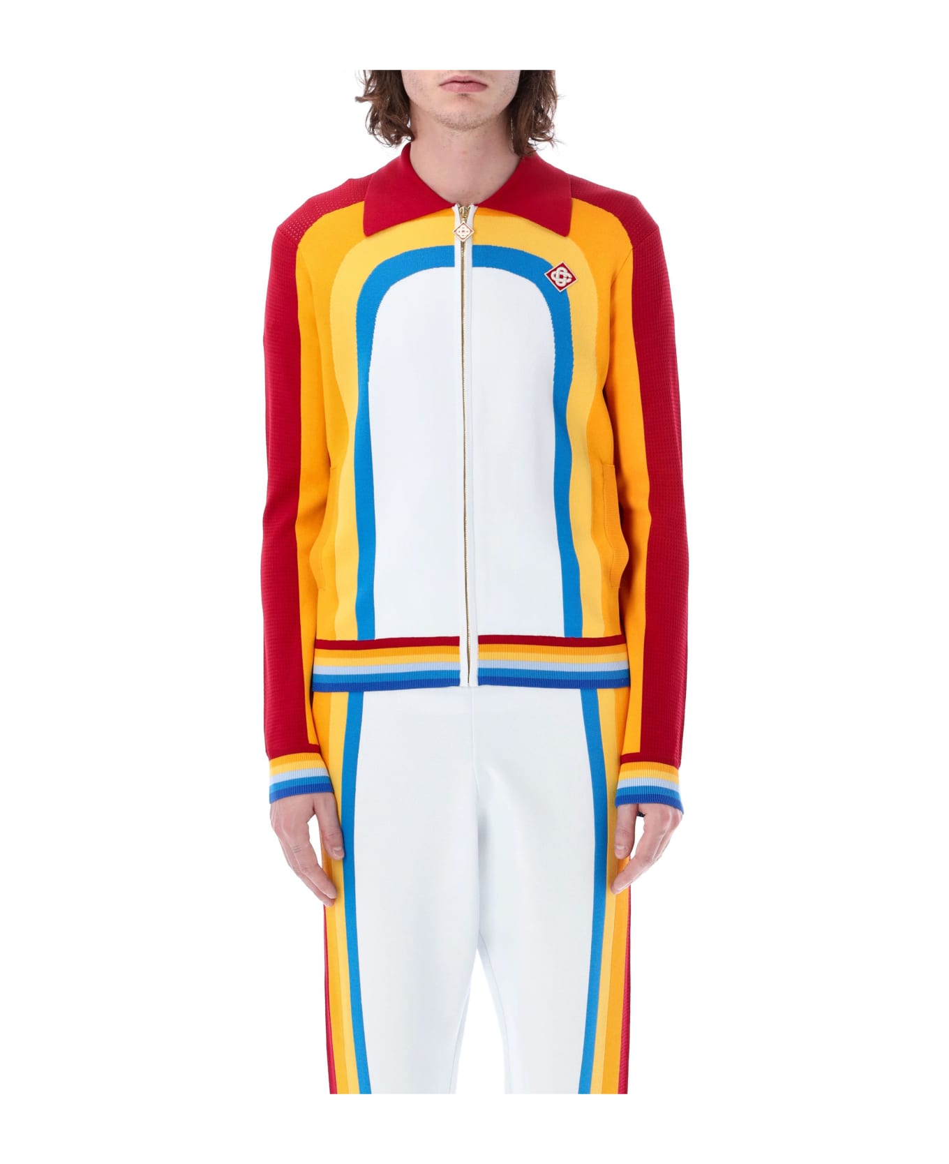 Arch Tracksuit Jacket By Casablanca. Featuring: Ribbed Pointed Collar Zip Fastening Side Pockets Long Sleeves Embroidered Logo Patch At Chest Large Casa Sport Embeoidery At Back Rib Striped Trims The Model Is 1,90 M Tall And He's Wearing Size L