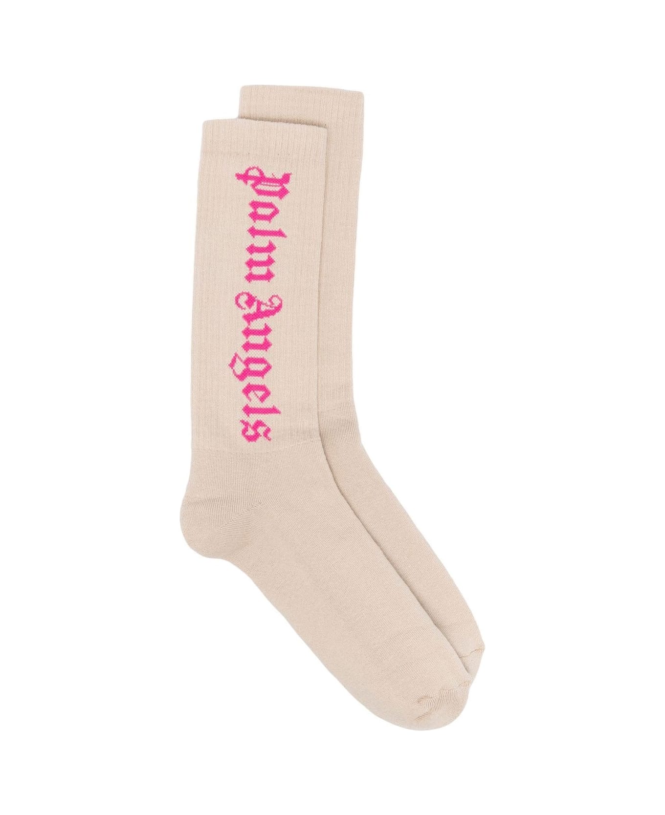 Palm Angels socks for men made of beige stretch cotton blend with ribbed knit and pink Palm Angels logo on the outside. Composition: Composition: 90% Cotton, 5% Polyester, 5% Elastane.