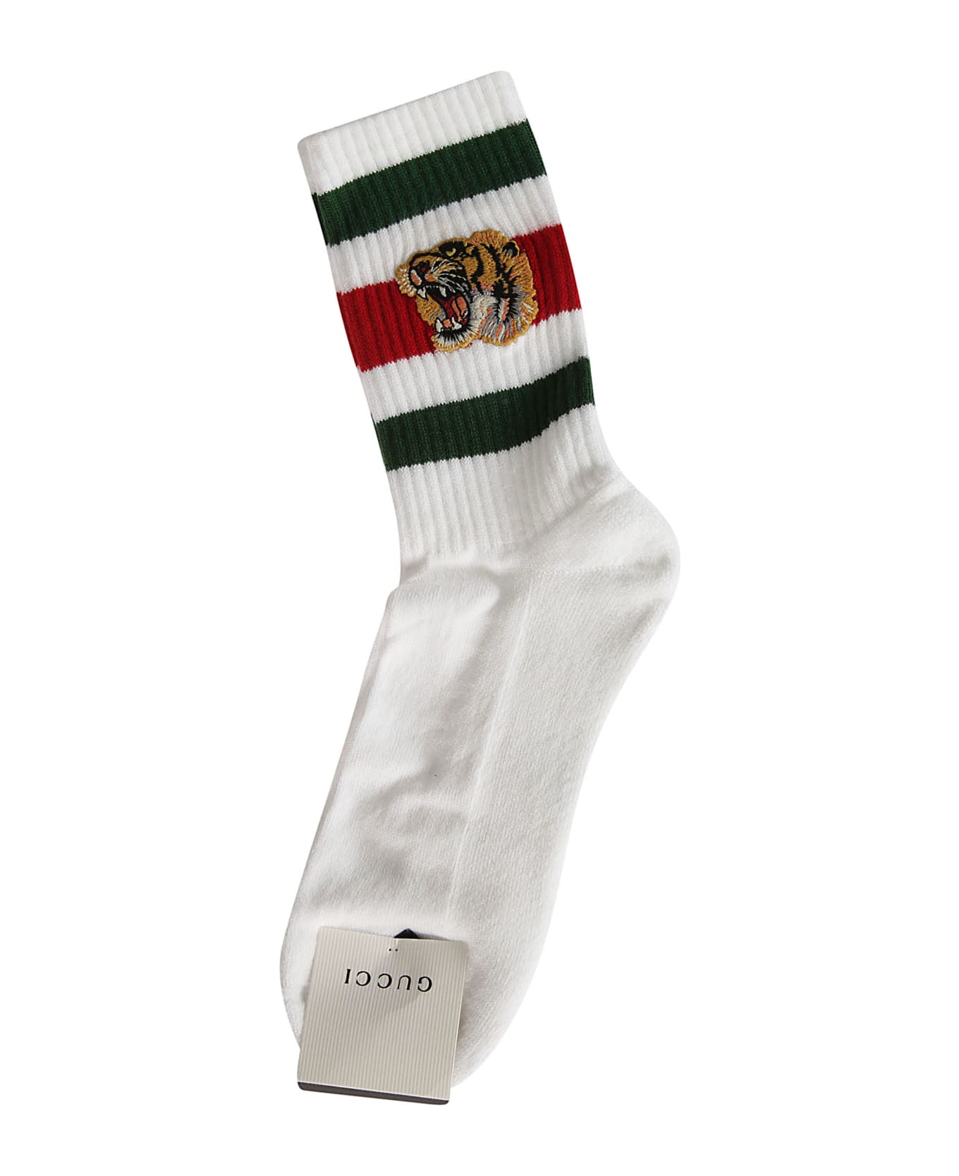 Tiger Motif Socks from Gucci: Green Tiger Motif Socks with striped trim and ribbed cuffs.