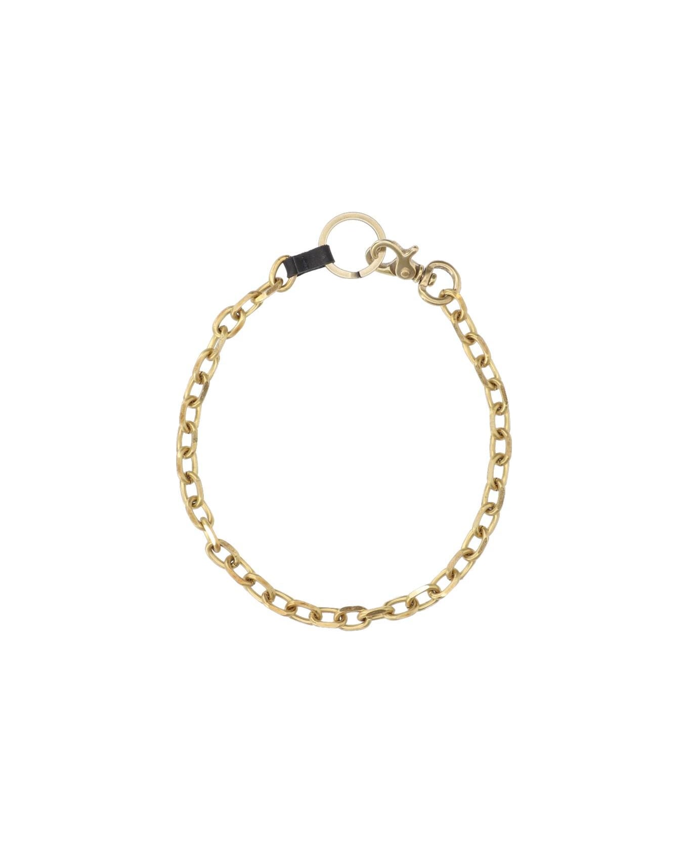 Our Legacy Ladon keychain necklace in gold brass with chain design, leather tab, engraved logo ring, and hook closure.