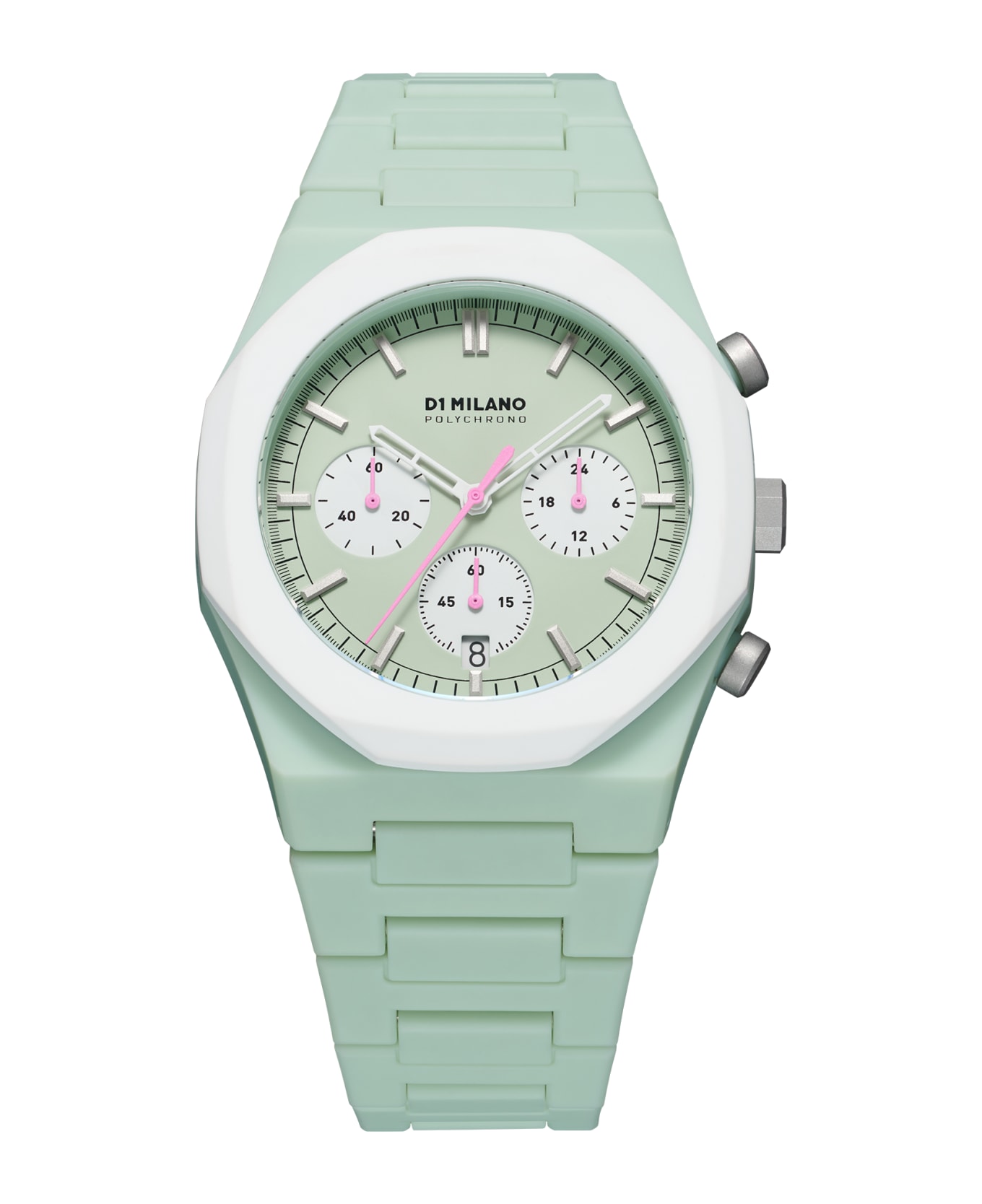 - Dial color: Menta opaca, quadranti secondari bianchi con dettagli rosa
