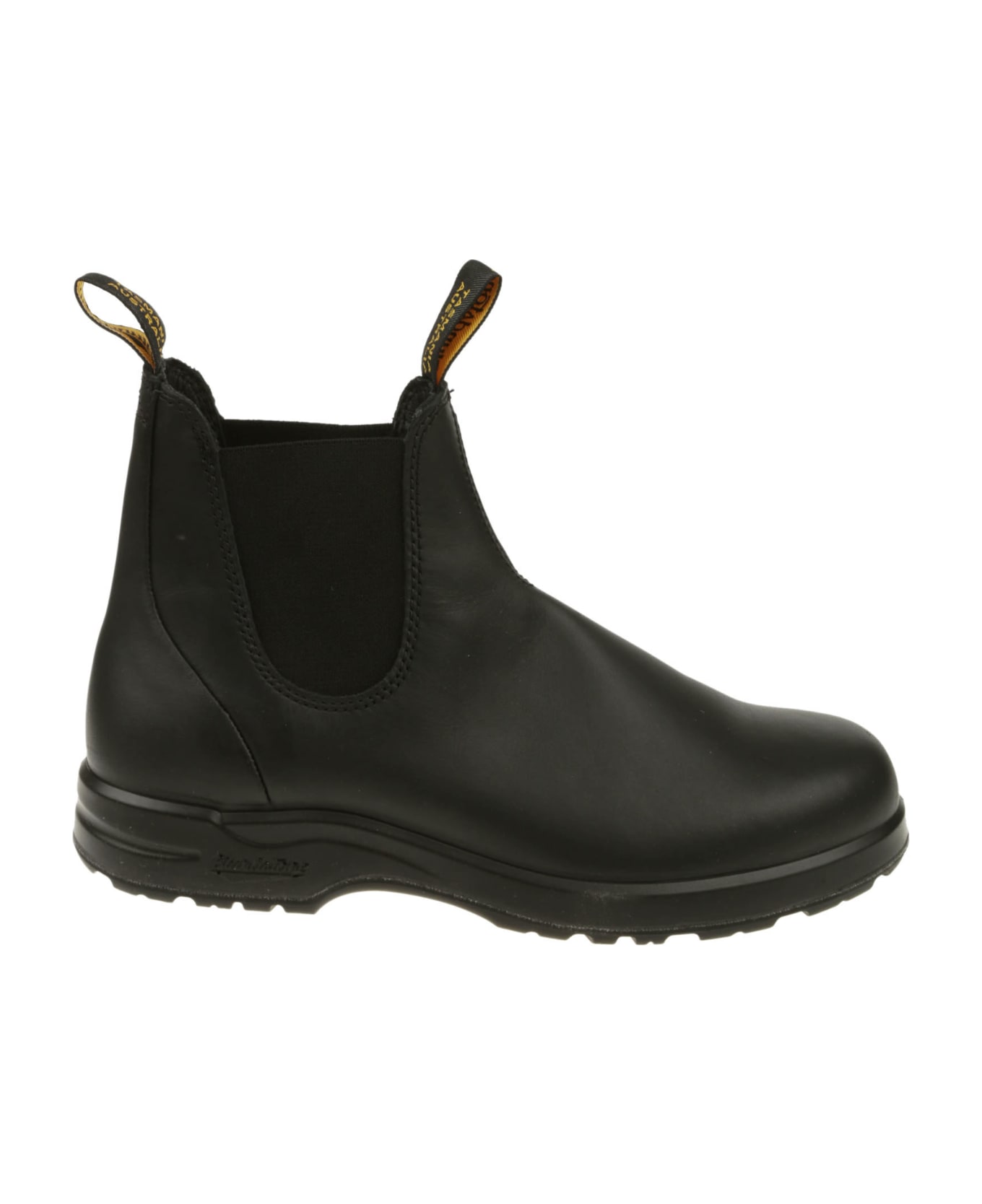 Blundstone Black leather boots, side elastic band, rubber sole, logo straps.