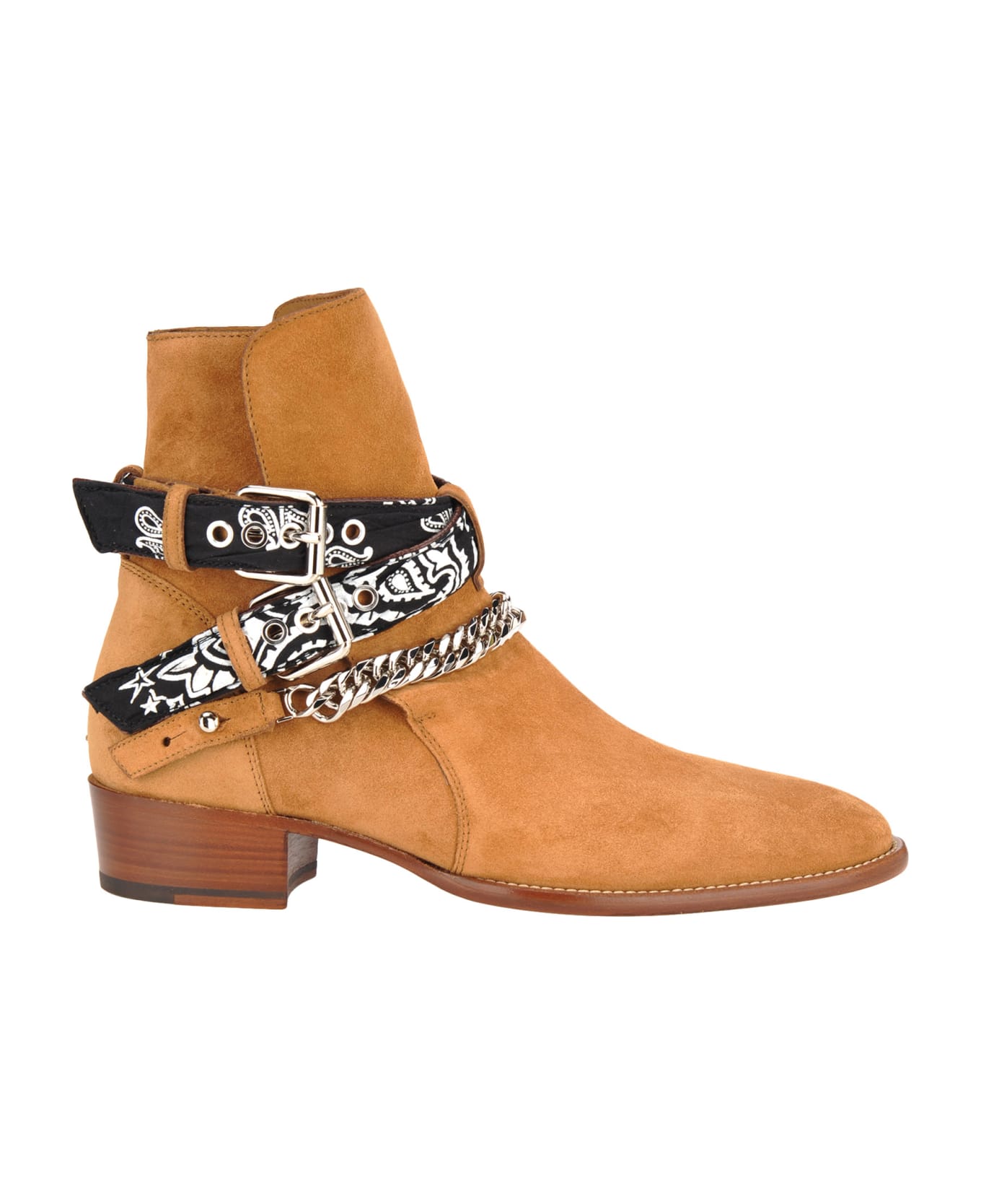 Brown Suede Leather Boots With Bandana Buckle By Amiri. Featuring An Almond Toe, A Slip-on Style, A Bandana Side Buckle Fastening, A Low Block Heel, A Chain Detail And An Ankle Length.