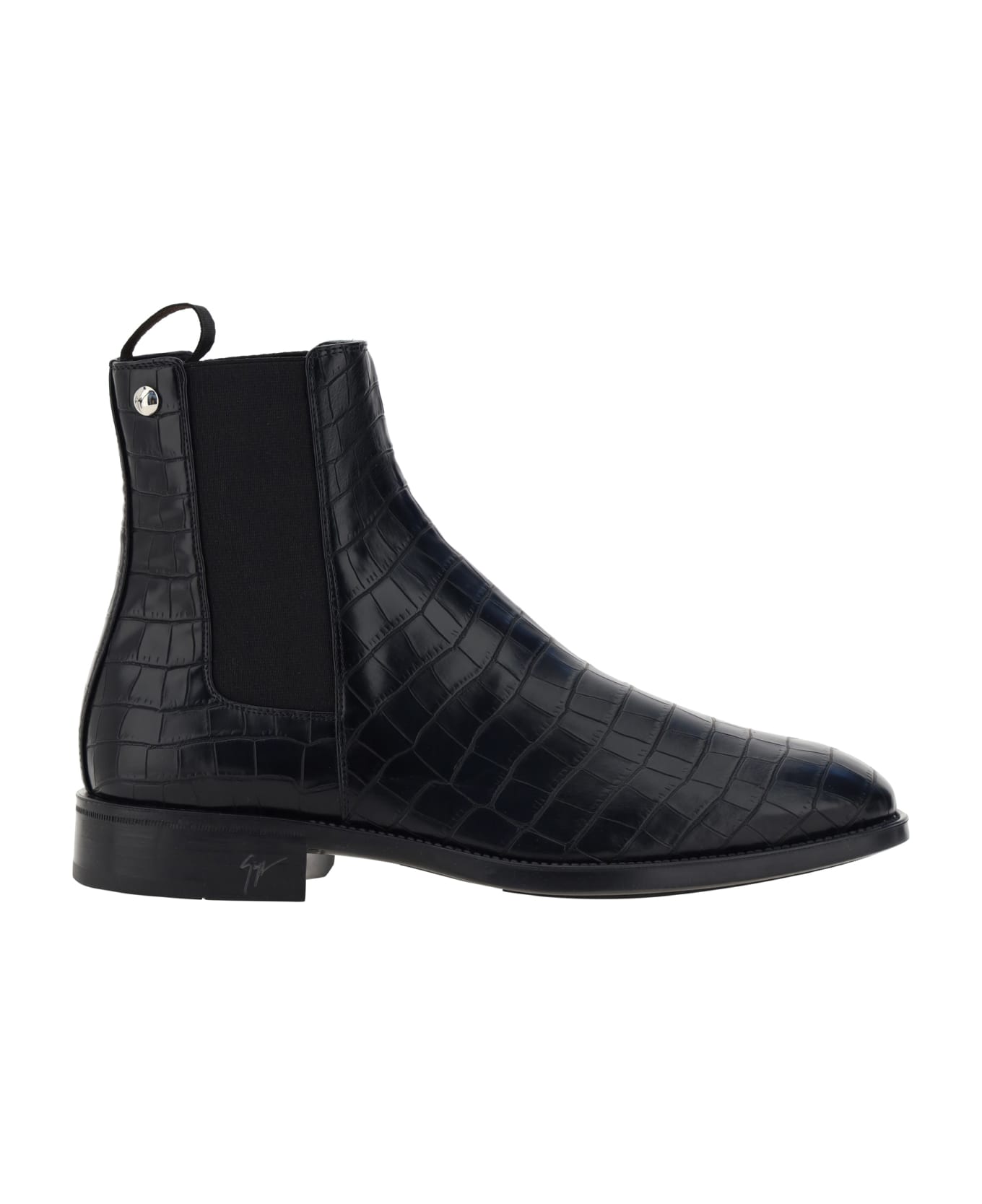 Calfskin ankle boots by giuseppe zanotti, elongated toe, leather block heel, elasticized bands on side panels, leather pullback for fit support, crocodile effect design.