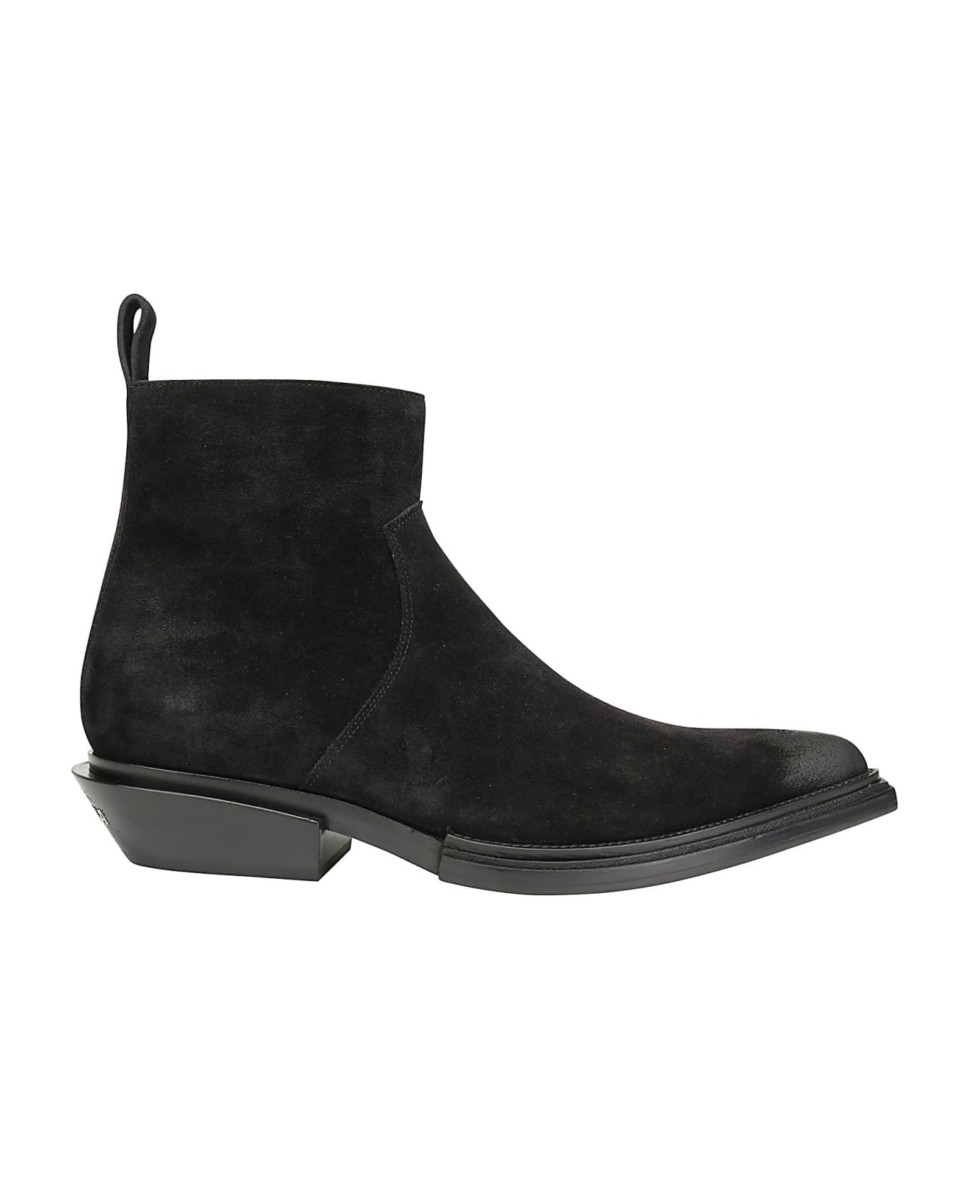 Black Suede Calfskin Leather Santiag Booties by Balenciaga, pointy ruined toe, ankle lenght, lateral zip fastening, white logo engraved on western heels. Composition: 100% Calf Leather Bos Taurus, 100% Calf Leather Bos Taurus