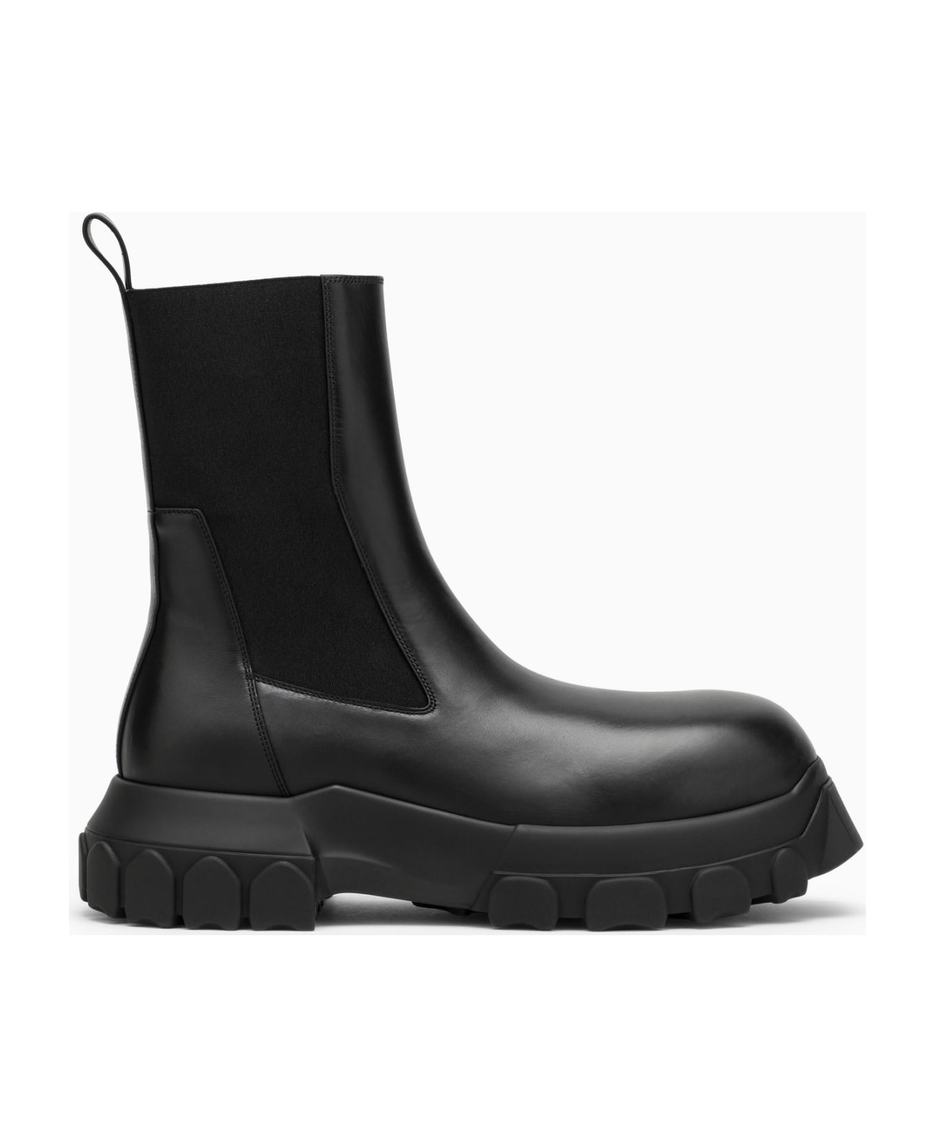 Black leather Rick Owens beatles boot, featuring a rounded toe, stiff shaft and a wide rubber sole.