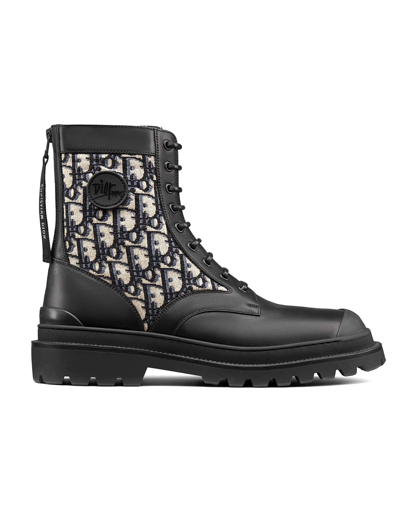 Ankle boot model Explorer from Dior Homme with beige and black Dior Oblique jaquard details in black leather. - Beige and black Dior Oblique jacquard