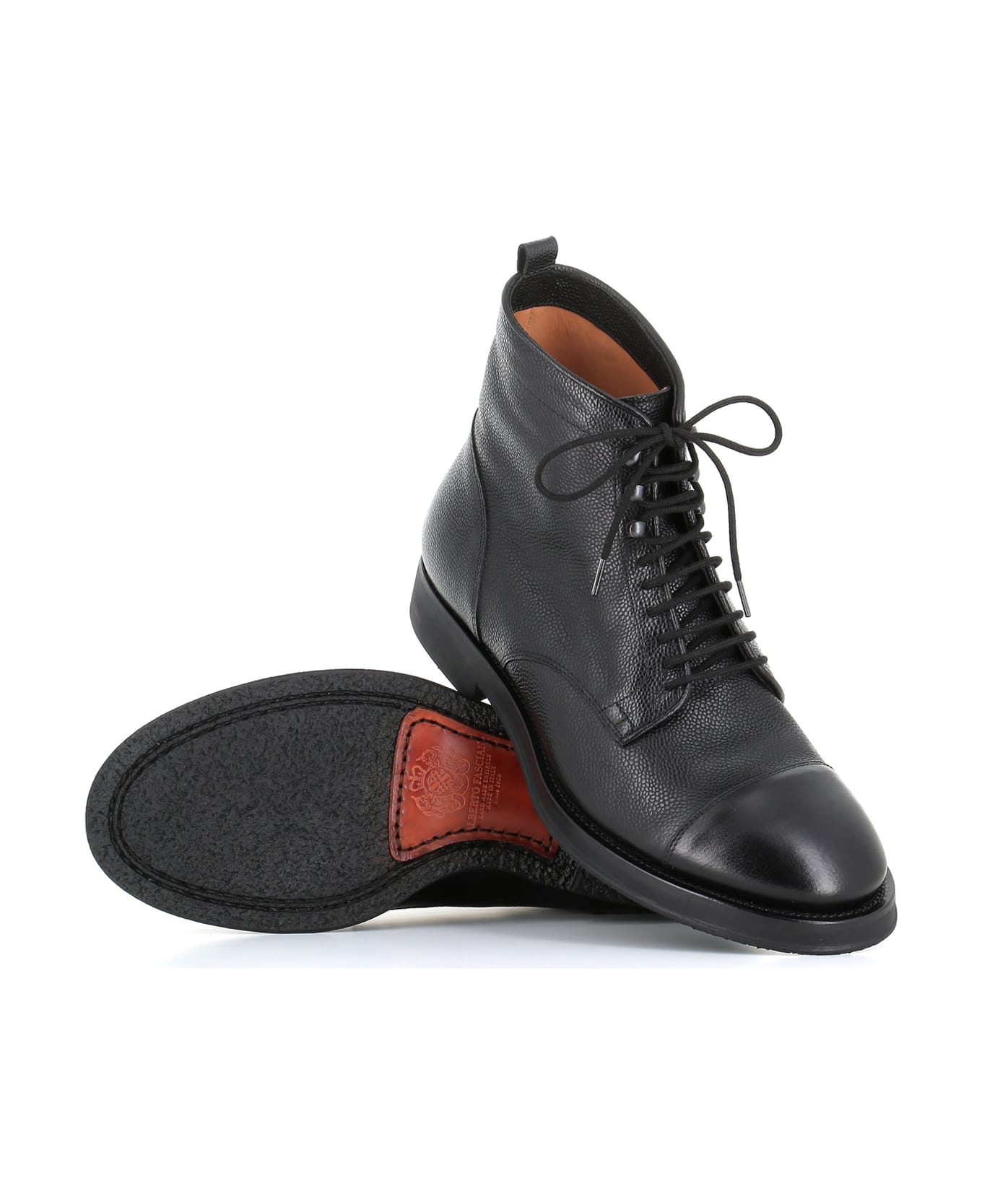 Black soft tanned leather with a rice grain texture lace-up boot from Alberto Fasciani. Lined interior. Leather sole with crepes sole. 'Blake Rapid' Artisan manufacturing. Heel: 3,5 cm