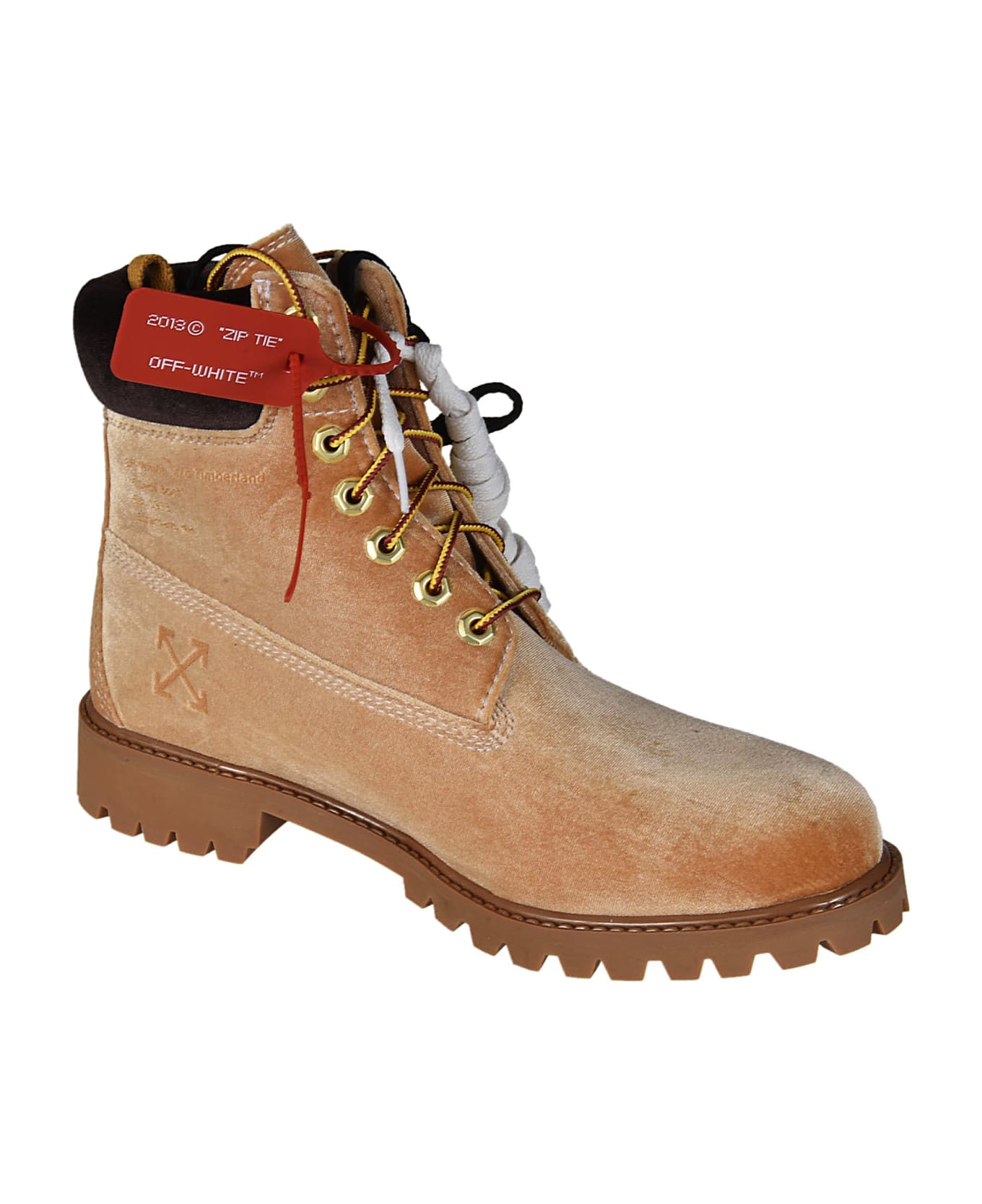 Off-White X Timberland Laced Boots from Off-White: Beige Off-White X Timberland Laced Boots with laced fastening, the Timbaland logo at the side, rubber ridged sole and logo insole.