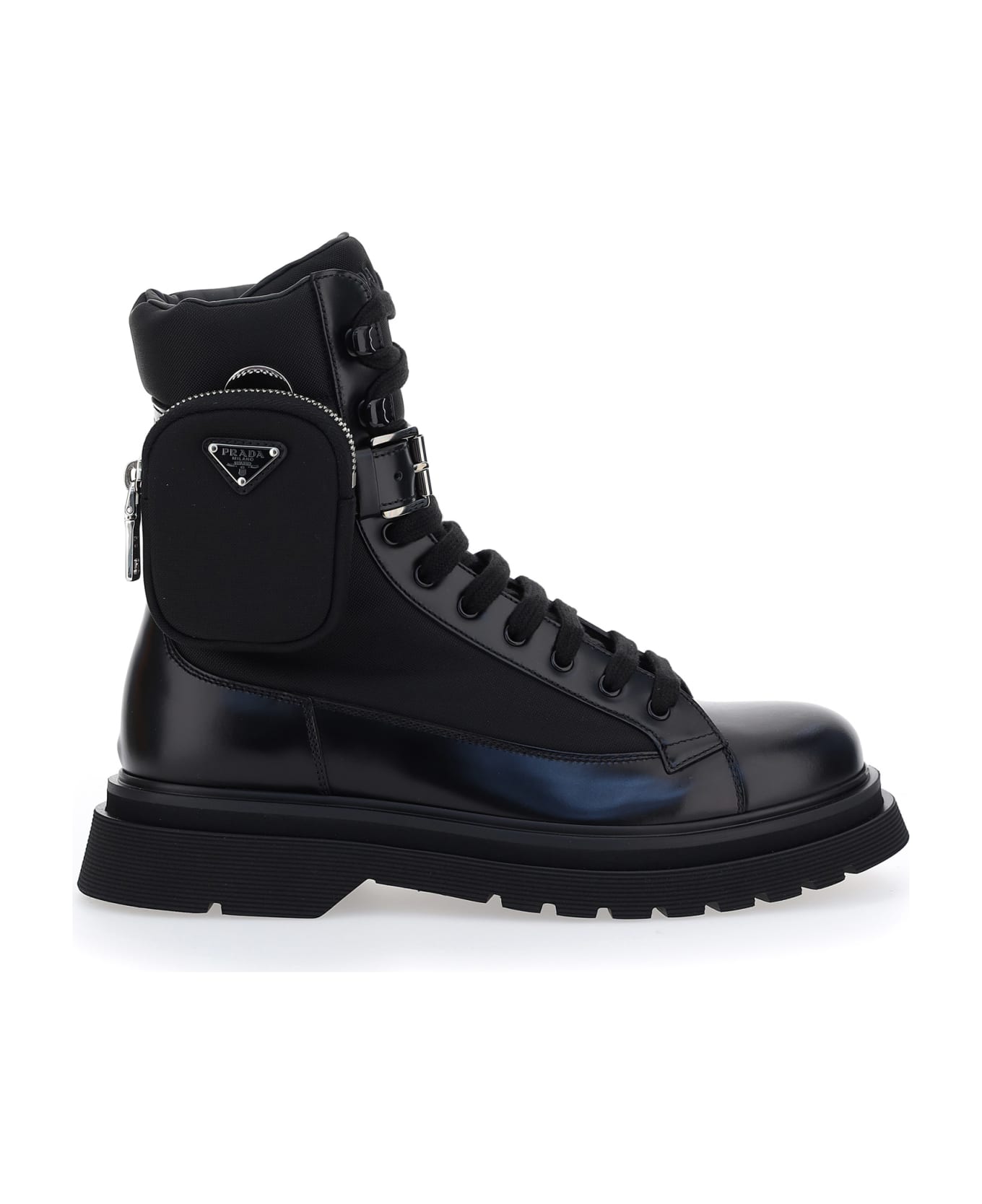 Black Calfskin Boots by Prada, round toe, lace up closure, front buckle with removable zipped pouch, engraved logo on back. Composition: 100% Calf Leather Bos Taurus, 100% Rubber