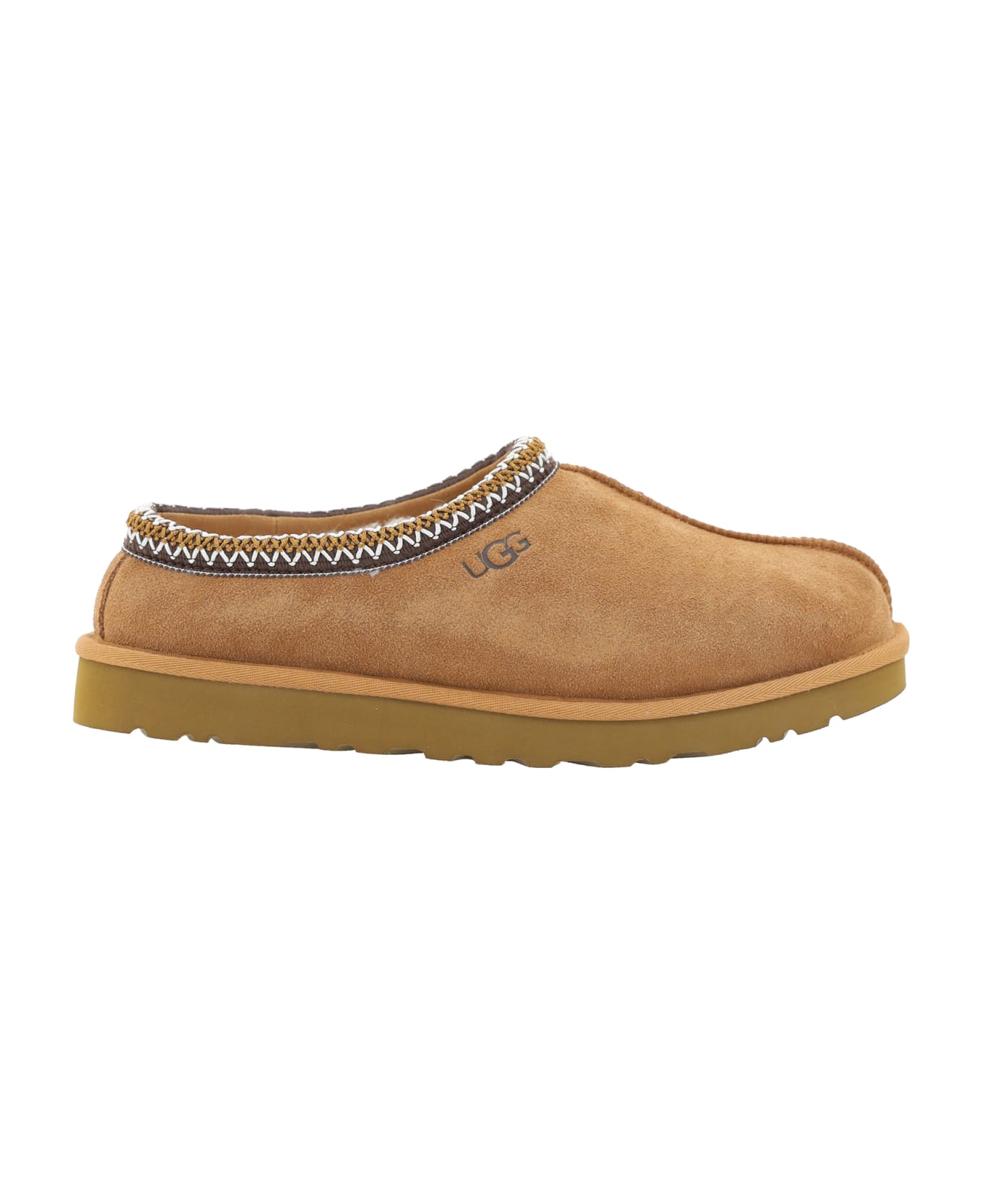 Goatskin tasman sabots by ugg, a knurled sole, round toe, suede effect design, soft shearling lining, iconic brand monogram embroidered on side panel, slip-on style.