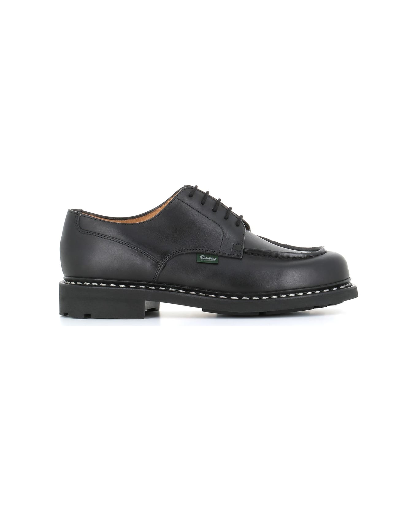 Black leather short tub derby from Paraboot, featuring by Norwegian construction on real rubber sole and 5 eyelets. Lined interior. Leather fund. Heel: 3,5 cm Composition: Leather
