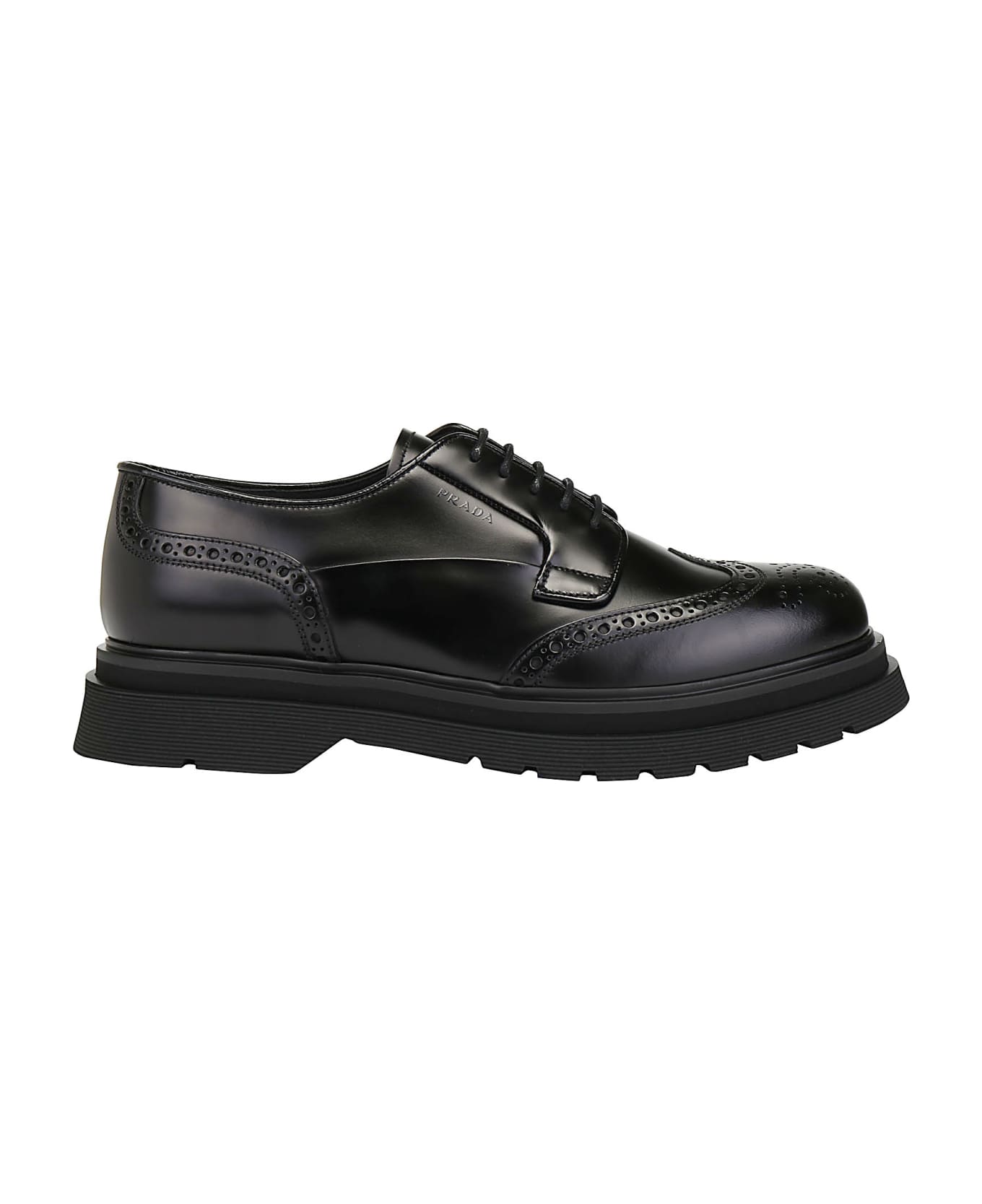 Black Calfskin Platform Derby Lace Up by Prada, featuring lace up closure, elongated toe, chunky platform, brand logo on insole and sole. Composition: 100% Calf Leather Bos Taurus, 100% Rubber