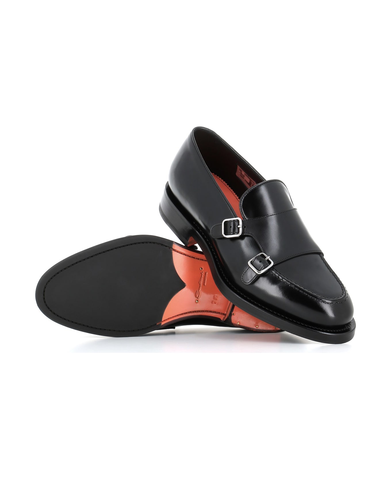 Black brushed leather loafer with buckles from Santoni, hand dyed. Lined interior. 'Goodyear' artisan manufacturing. Double leather sole. Heel: 3 cm
