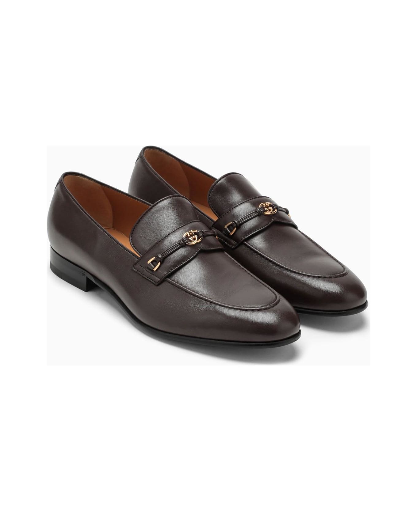 Loafers by Gucci in cocoa-coloured leather, featuring GG Crossing detail with a gold finish on the front and a leather sole.