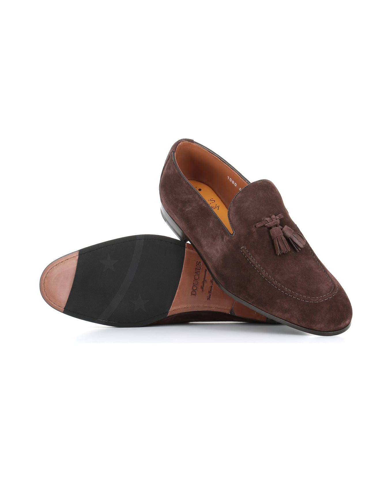 Dark brown suede tassel loafer from Doucal's, featuring by to stitching artisan manufacturing. Blake processing. Leather sole with rubber insert. Heel: 2 cm