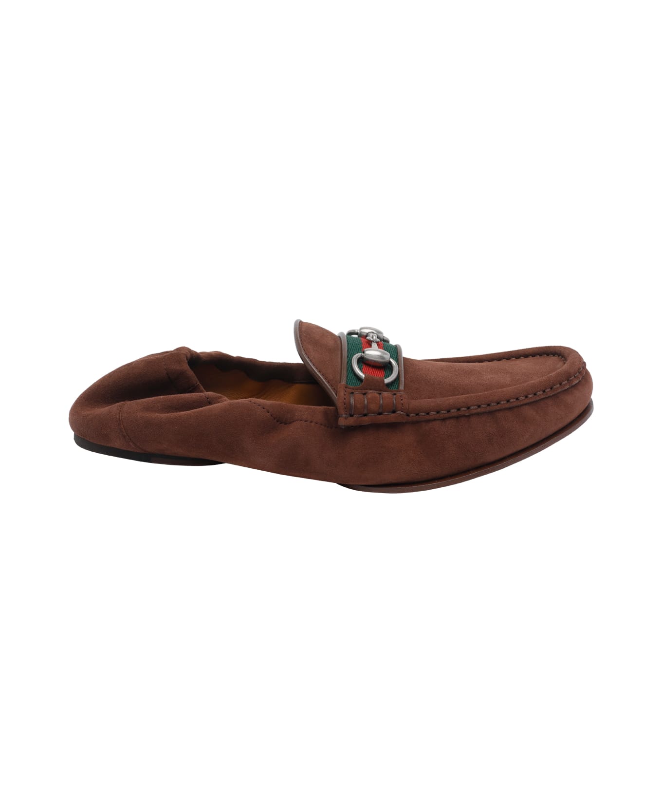 Gucci brown Horsebit loafers, suede upper, round toe, Web logo, slip on Composition: 100% Suede / Rubber Sole
