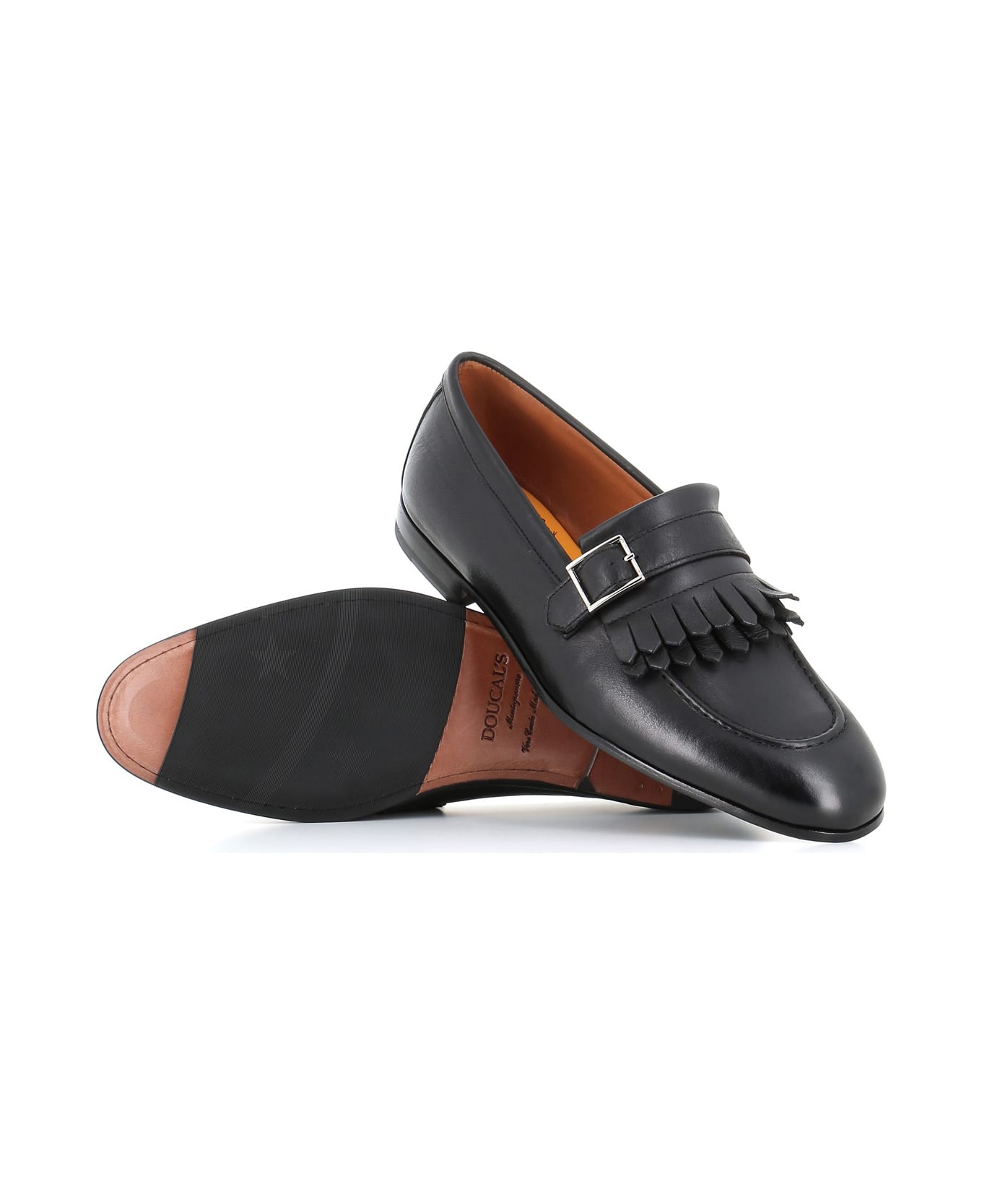 Black leather Loafer from Doucal's, featuring by a buckle and fringe and by to stitching artisan manufacturing. Blake processing. Lined interior. Leather sole with rubber insert. Heel: 2 cm