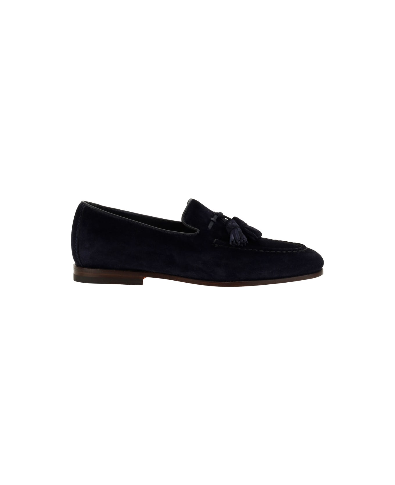 Calfskin loafers by santoni, suede leather design, slightly elongated toe, leather block heel, leather front tray, pendant tassel detail applied to tray, logo-embossed insole.