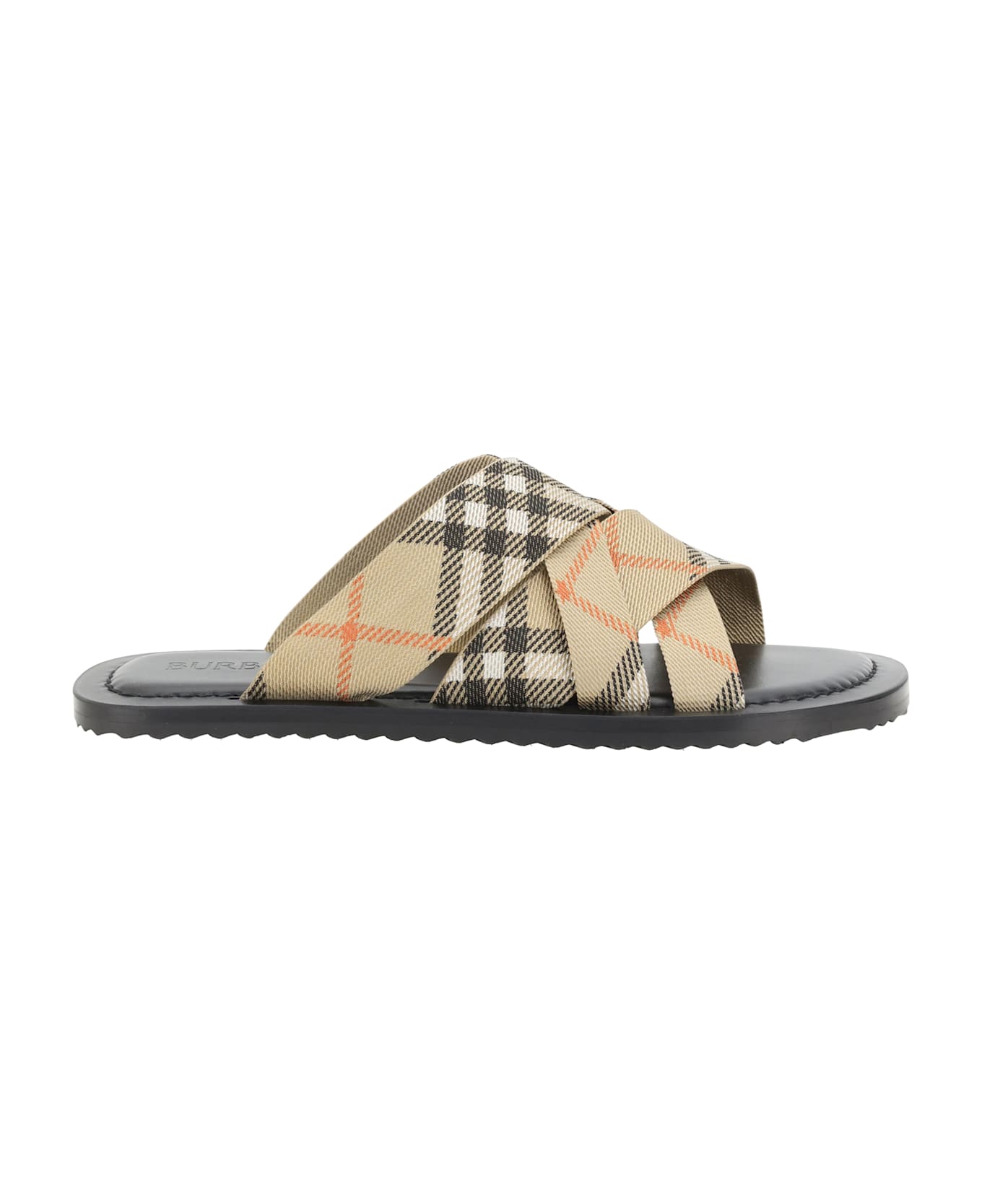 Sandals by burberry with crisscrossed straps on the front, embellished with the iconic archivio check pattern that represents the brand's heritage. the almond toe lends an elegant and refined touch, while the logoed insole adds a distinctive detail. the flat sole ensures comfort and stability, making these sandals a perfect accessory for a sophisticated summer look.