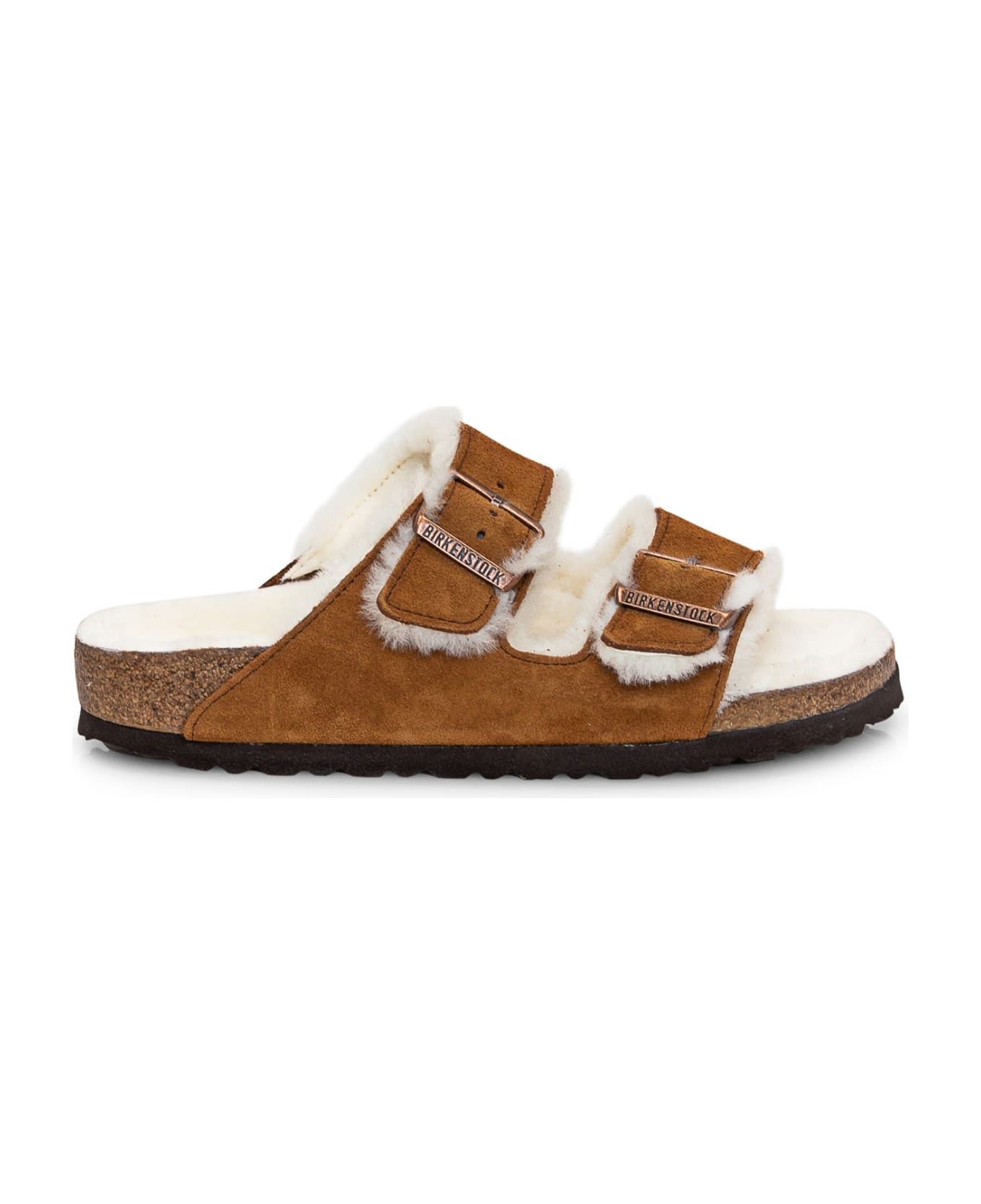 Low suede slippers. Two adjustable straps. Fur lining. Logo on side and buckles.