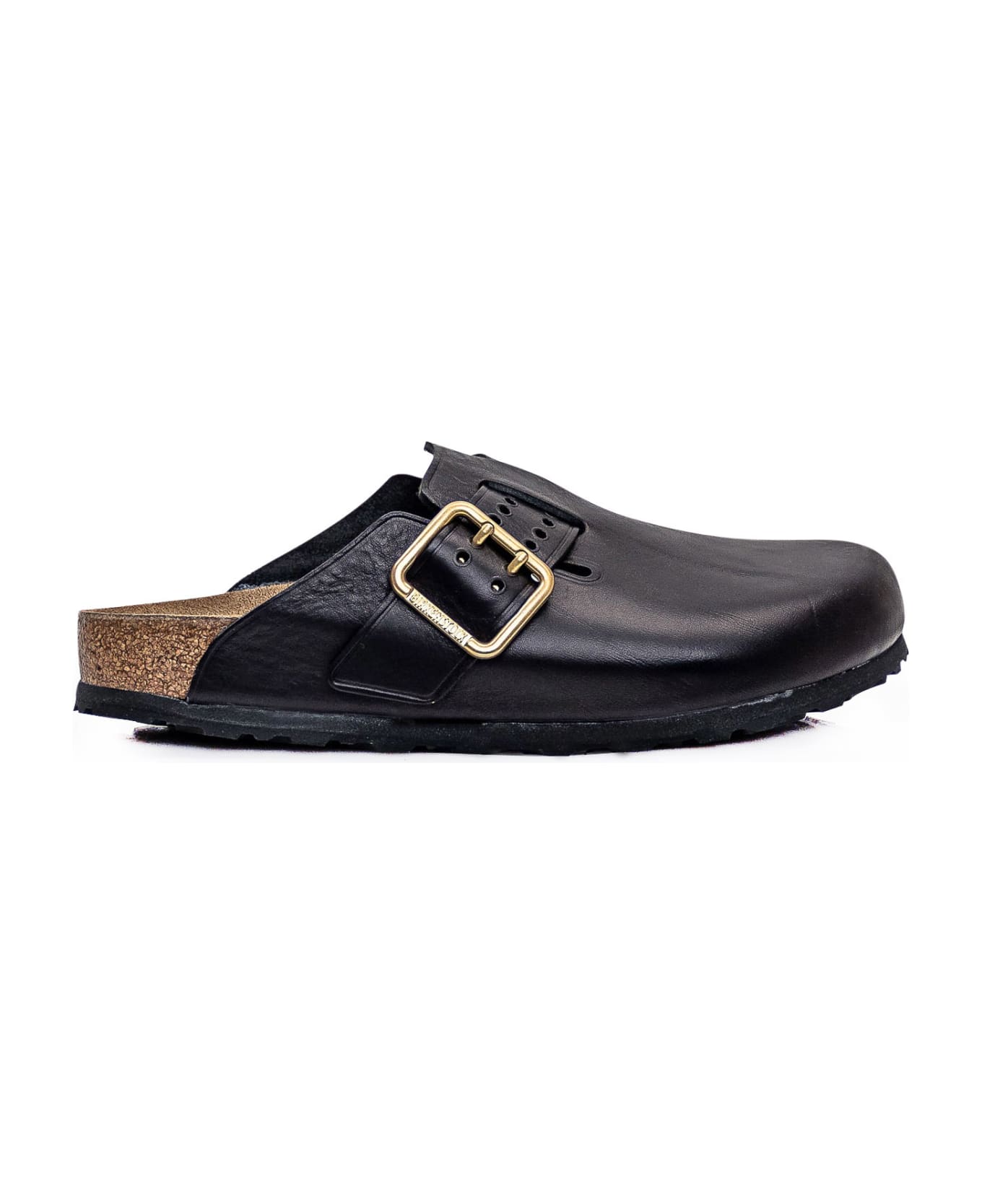 Black leather sabot. Slip-on. Strap with an adjustable metal pin buckle. Anatomical cork footbed. Logo on the side.