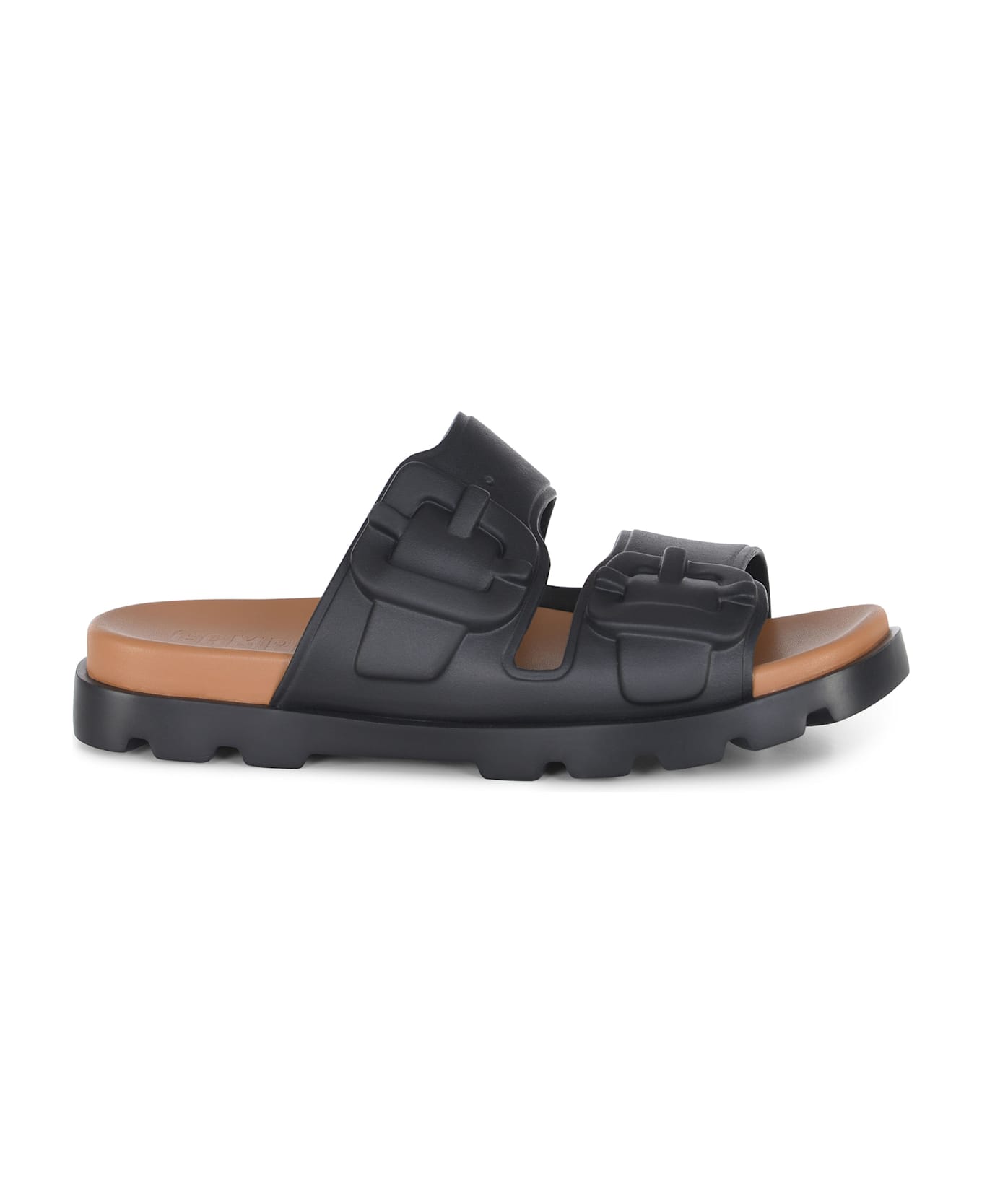 Camper sandals "Brutus" made of black rubber blend. PU insole in Cuoio color. Open toe. EVA sole. Double buckle with fake straps. 58% fabric 43% EVA