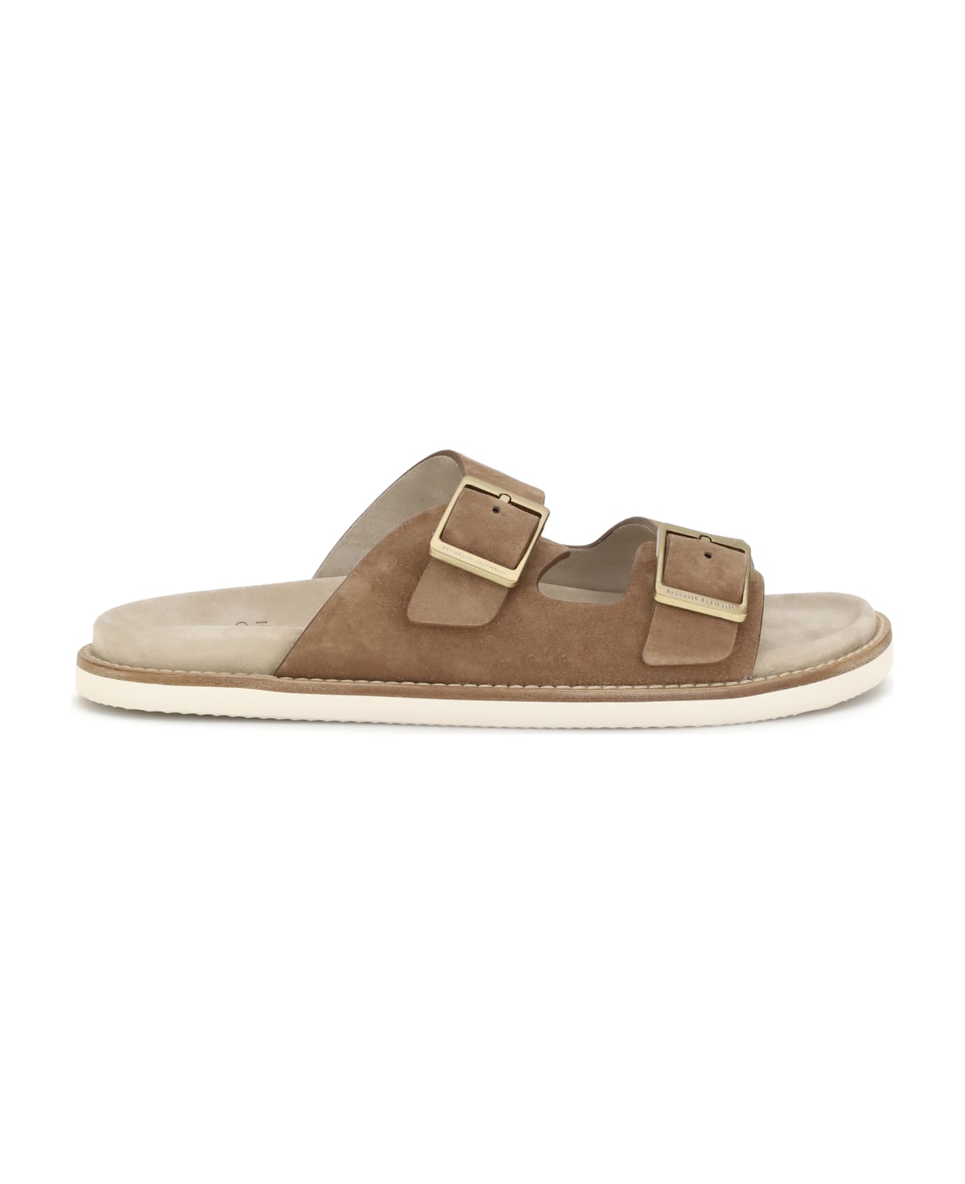 Brunello cucinelli's leather sandals combine elegance and practicality with a refined suede design. featuring a double front band with an adjustable strap, they have a flat sole and round toe for maximum comfort. the press-stamped logo insole adds an exclusive touch, making these sandals perfect for those looking for style and quality in every detail.