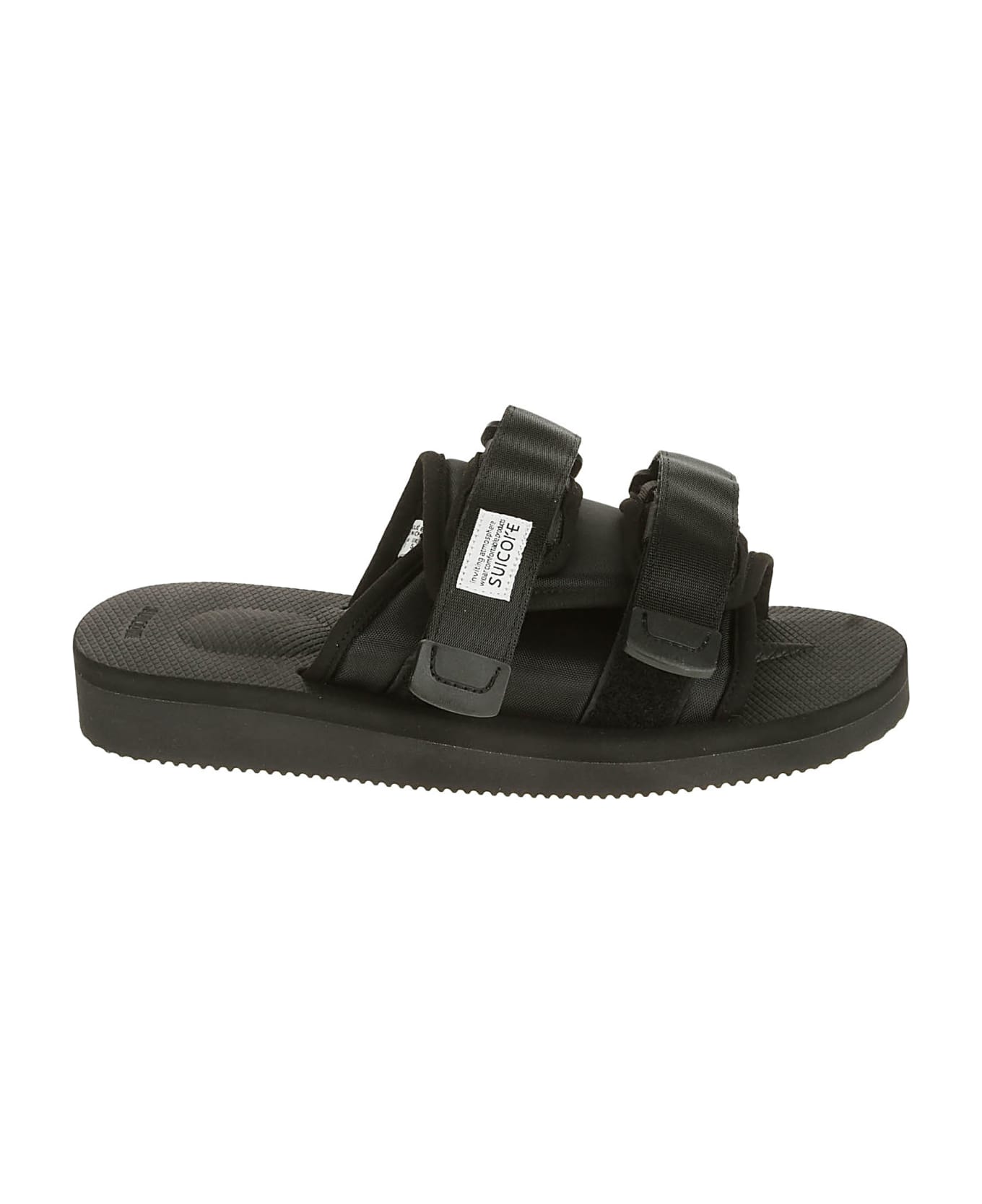 Suicoke Black nylon slipper, adjustable closure, logo insert, rubber sole.
