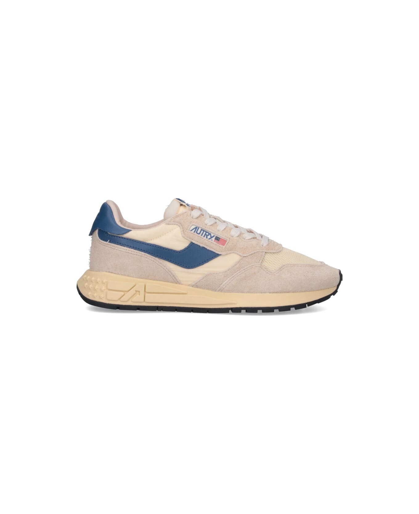 Autry "Reelwind Super Vintage" sneakers in beige nylon with calf suede trims, round toe, lace-up closure, logo label on the tongue, multicolor logo on the side, blue leather insert on the side, blue leather tab on the back, embossed logo detail, textured rubber sole, embossed logo detail on the side.