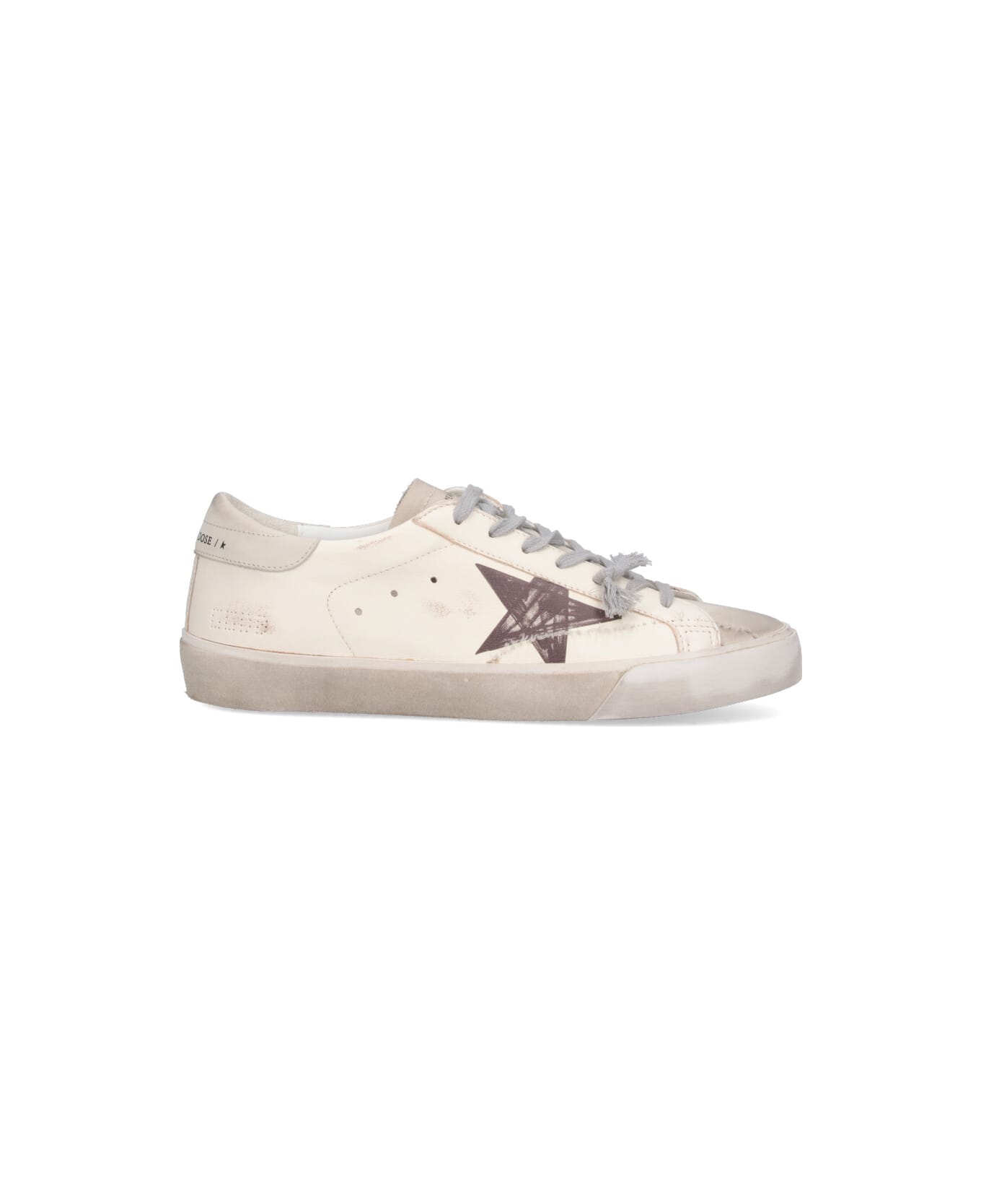 Golden Goose "Super-Star" sneakers in white leather with all-over usured details, round toe, lace-up closure, black embossed logo on the tongue, brown star logo print on the side, perforated logo on the side, tab logo print on the back, rubber sole.